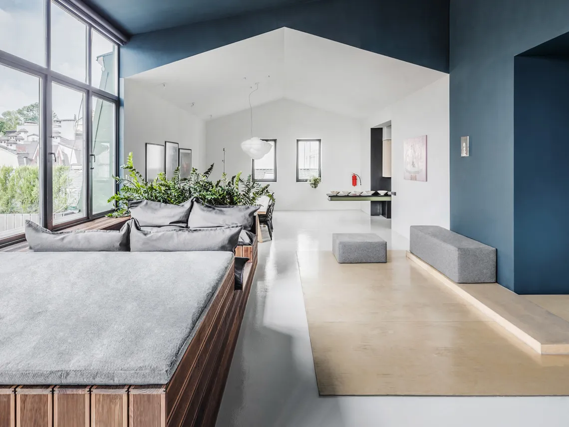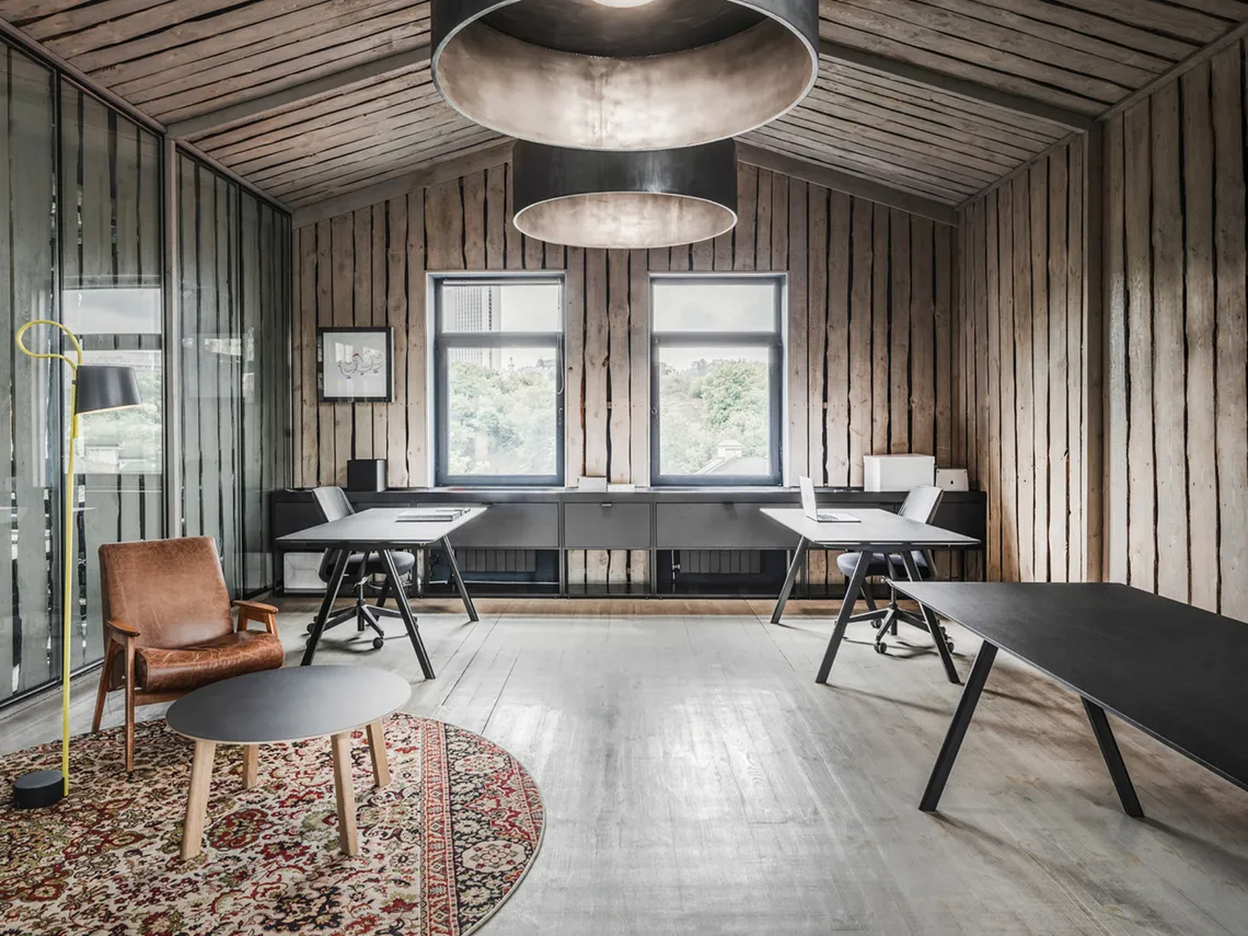 A detached built-in barn house accommodates the working space of three co-founders and executives of Banda Agency.
