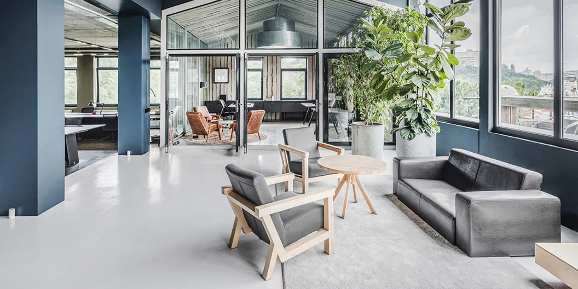 The office is divided into the following functional units: a front desk, 4 working spaces, 2 meeting rooms, 2 lounge areas, a kitchen, and a terrace.