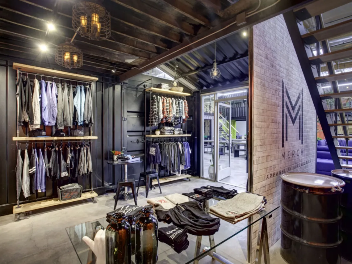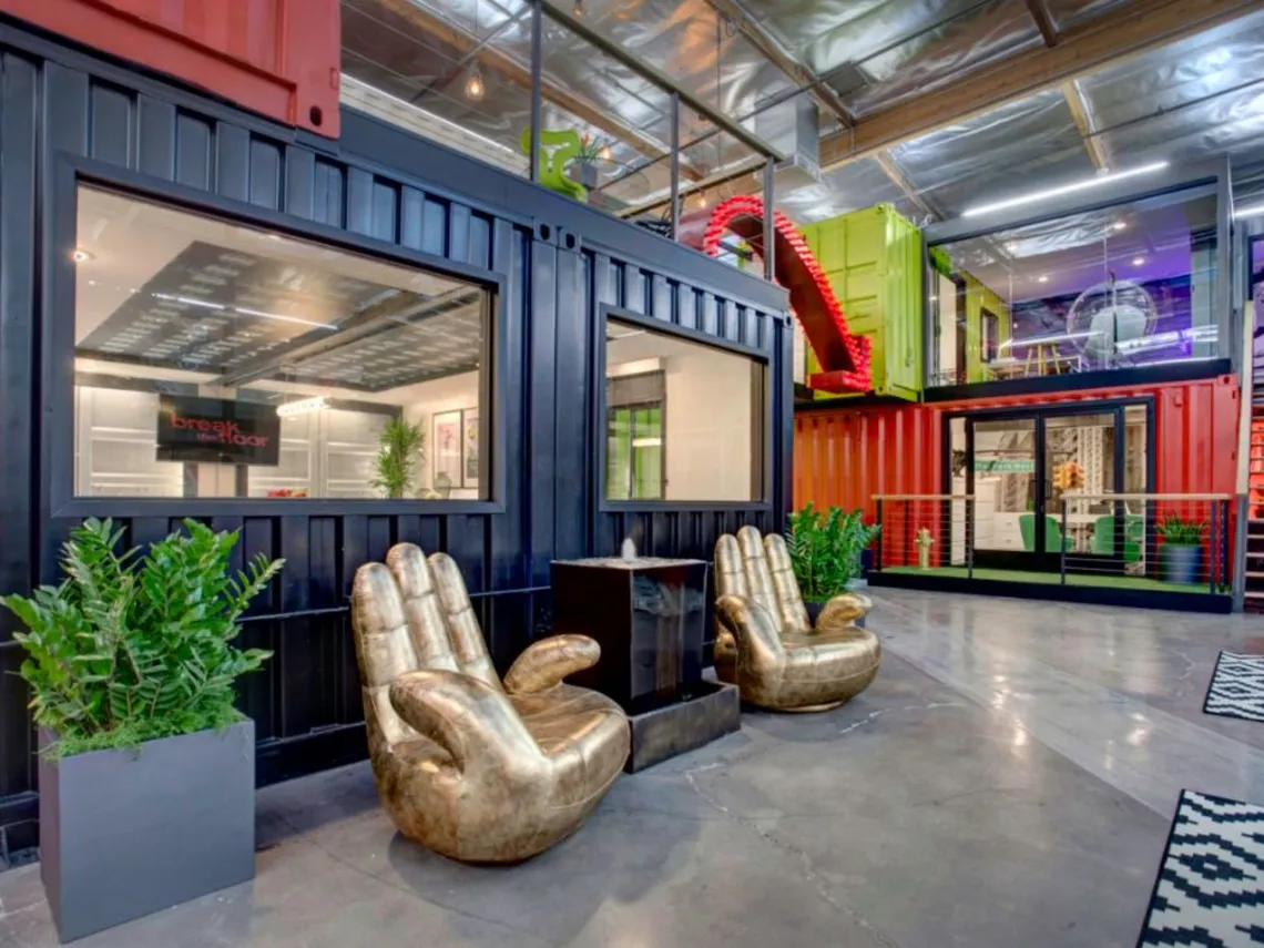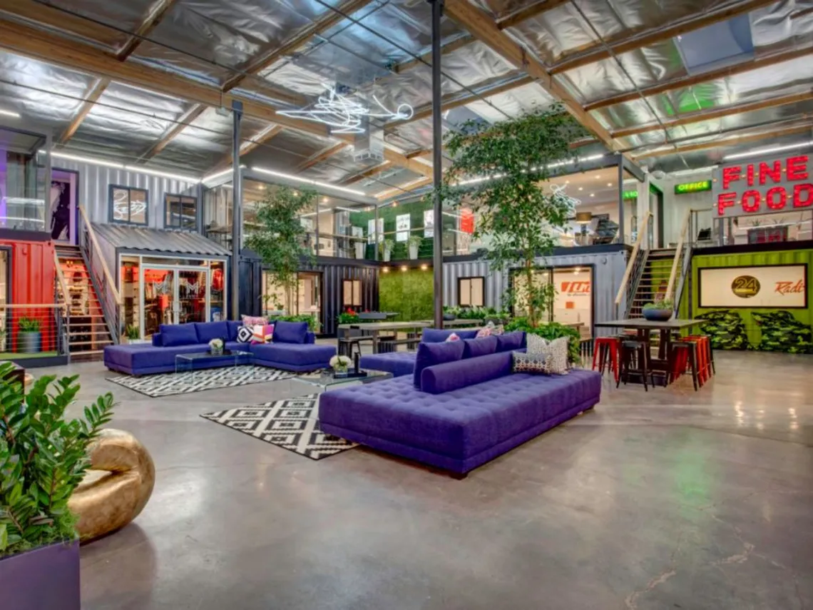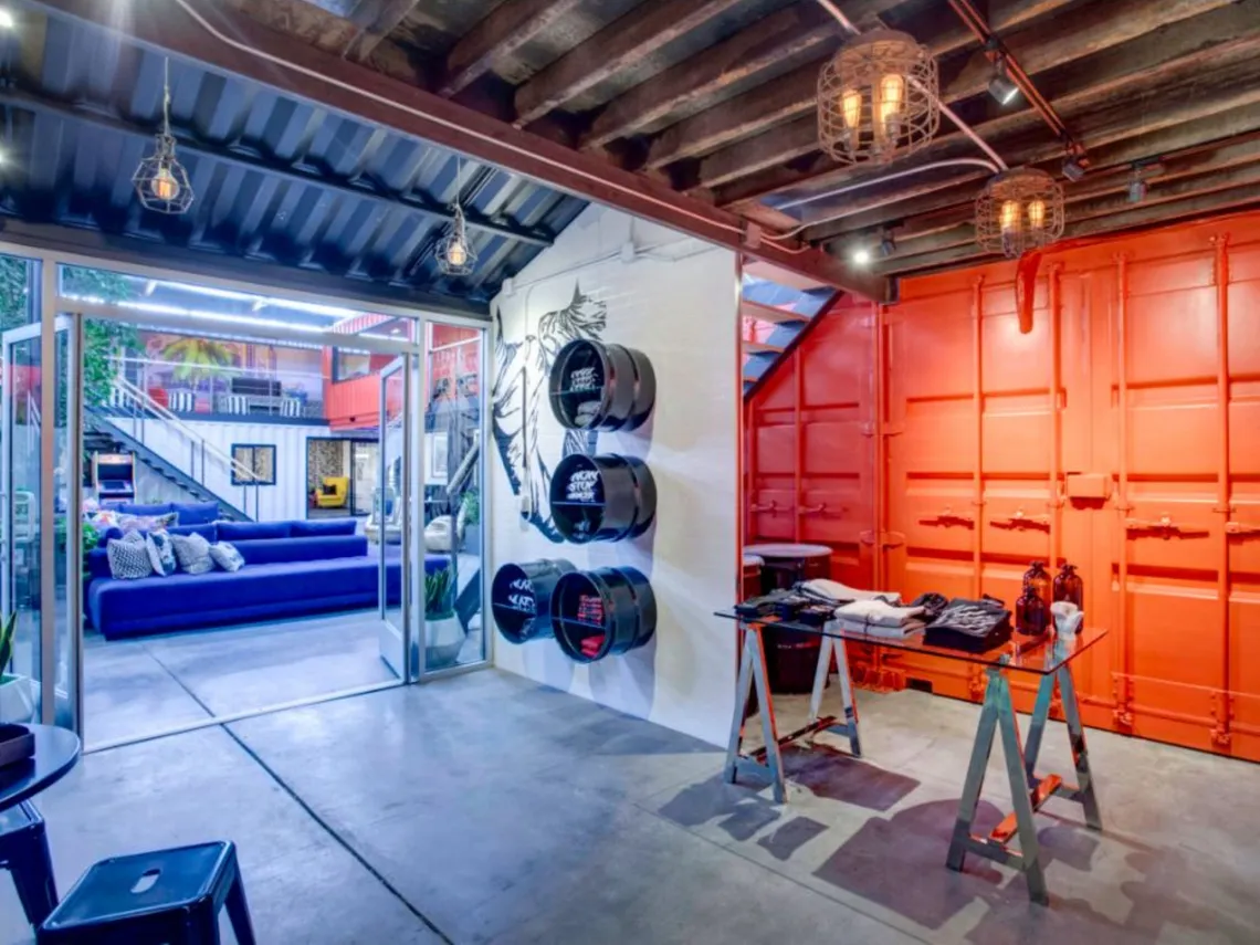 In addition to the areas within the shipping containers, the space also features a large "outdoor" courtyard complete with live trees and plants, a retail store and a games room.