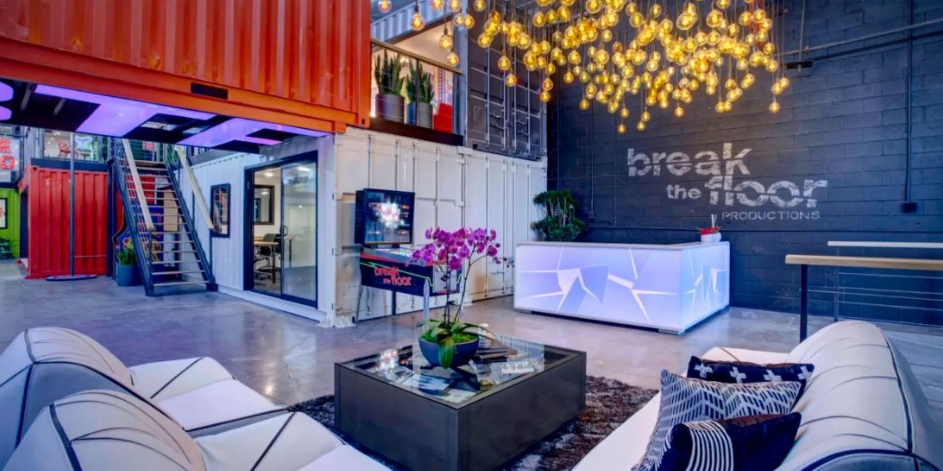 Tasked with overseeing the transformation of this empty warehouse into a new 20,000 sqft headquarters for Break the Floor Productions - one of the world's preeminent dance entertainment companies - Kyle Spivey Designs repurposed more than 30 shipping containers to accomodate executive offices, creative spaces, conference rooms and lounges.