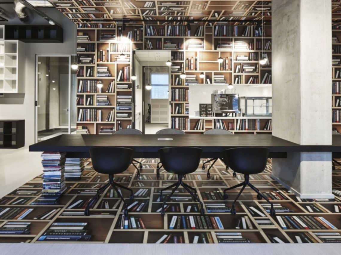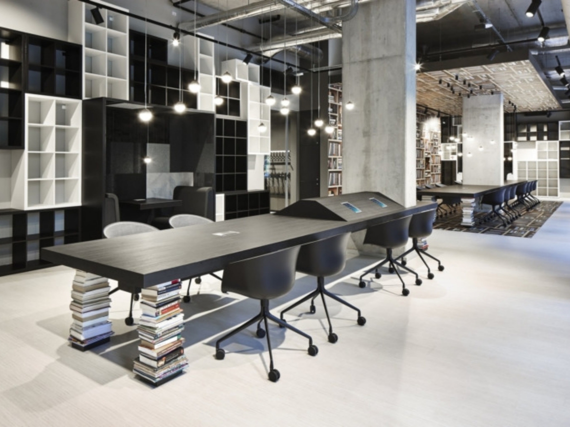 Because the book world of adventure, knowledge and science is not black and white, a photo print of a huge colourful bookcase has been used to cover the floor, wall and ceiling - the only colour accent in the space. The bookstore and office are separated by a facility unit where the kitchen, toilets and engineering rooms are housed. A special food concept based on healthy, sustainable food with specialities from all over the world is embraced, enabling people to work in the bookstore, have a healthy lunch or book it for a meeting.