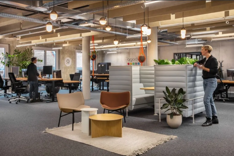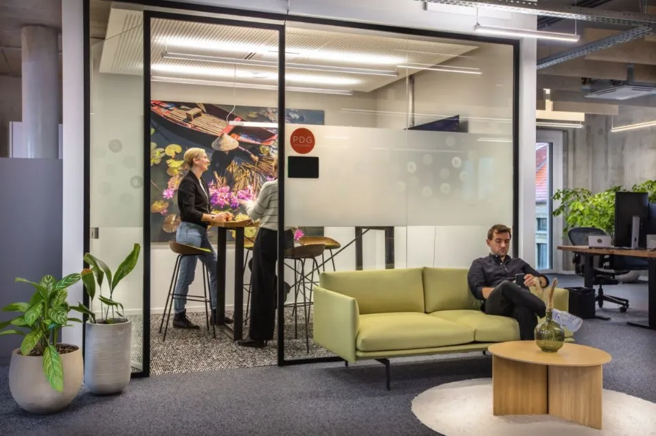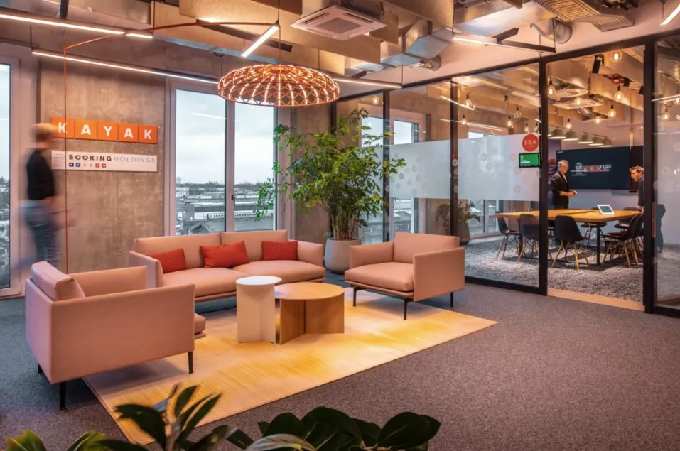Gensler‘s design for the KAYAK offices in Berlin merges existing furniture with a modern, international aesthetic, featuring distinct areas reflecting global destinations and fostering collaboration among Booking Holdings brands.