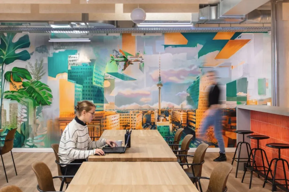 The heart of the space is a big open team area that is ideally fitted for lunch breaks, different events and large office meetings, with flexibility for variable furniture setups. Inspired by the flair of Berlin, this area features two cutting-edge AI-based murals from a local artist with whom Gensler collaborated. Spanning more than nine meters, the painted murals showcase vibrantly coloured collages from Berlin while reflecting upon the city’s unique characteristics.