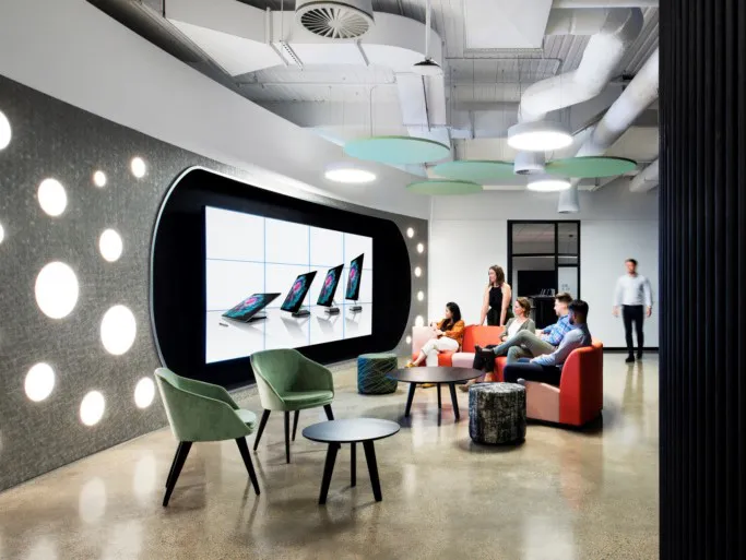 When entering the Customer Experience Centre, curved partitions and feature lighting create leading lines deeper into the floor plate where digital screens, demonstration zones and interactive learning spaces show off Microsoft's impressive and current technologies.