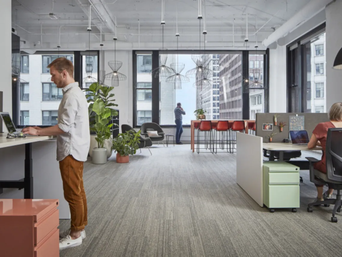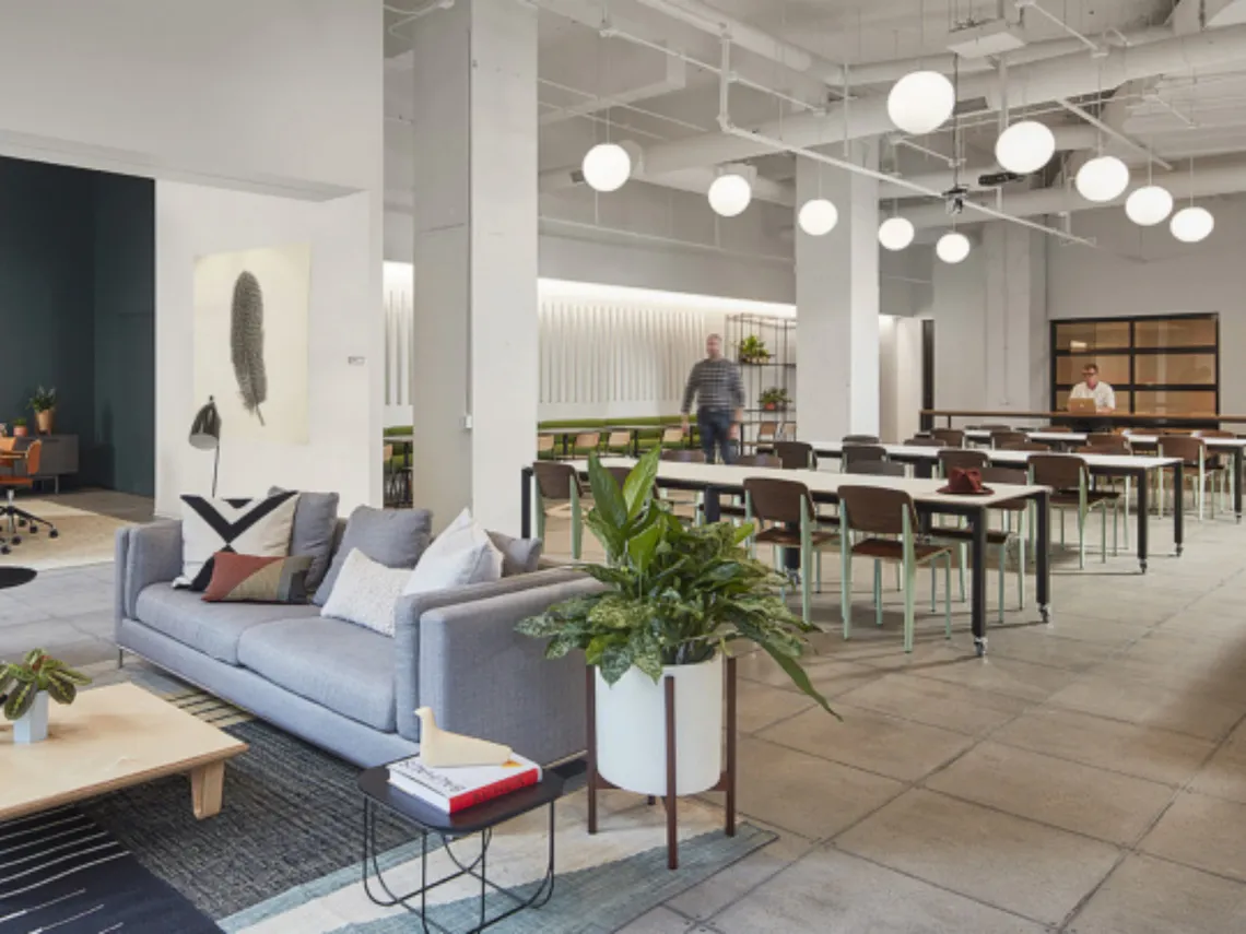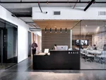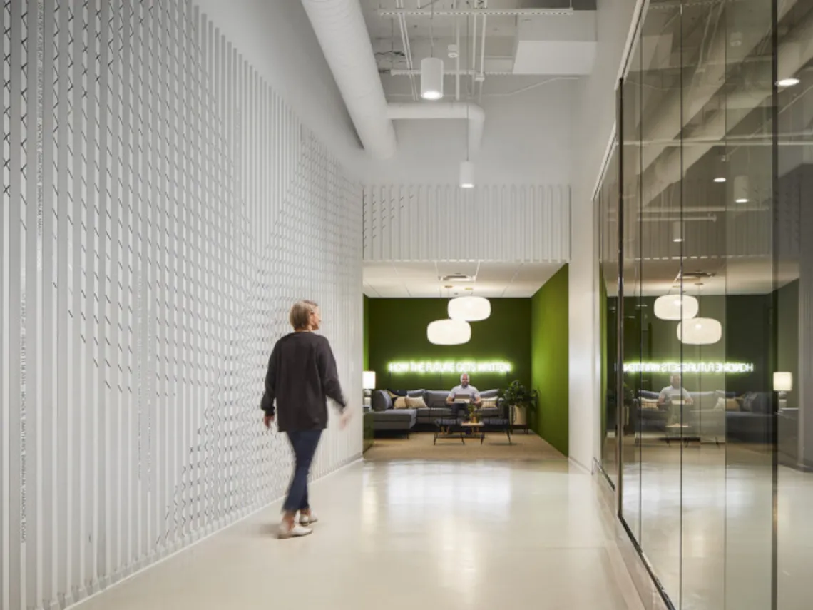The company exists at the overlap of technology and humanity, with their software transforming data into language. Areas where activities overlap are therefore celebrated in the workplace and the Chicago Bauhaus style was used as the aesthetic driver to give a local inspiration, but also to speak to innovation and technological leadership.