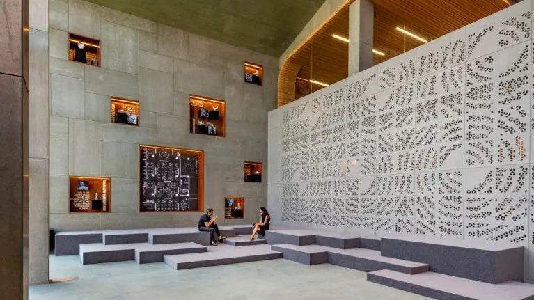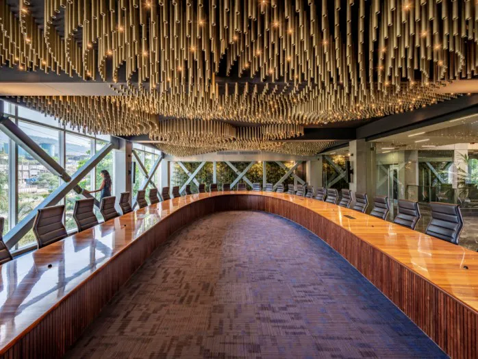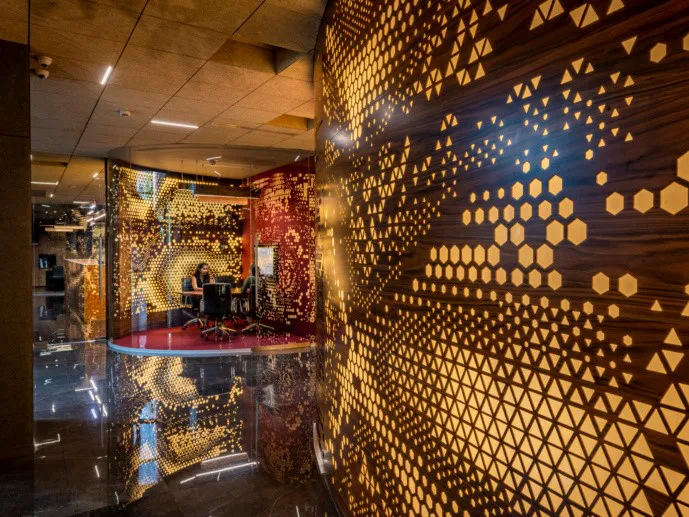 Lighting has been integrated into the design in multiple ways. Through perforated wood partitions, pyramidal ceilings and a conference room with an installation of light-infused aluminum pipes.