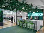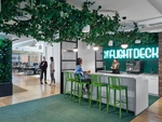 An impressive stairwell spirals asymmetrically and connects the 3 levels of the office. Each level has been designed with a material palette of glass, metallic paint walnut and wood. Cork and concrete accentuate each area differently.