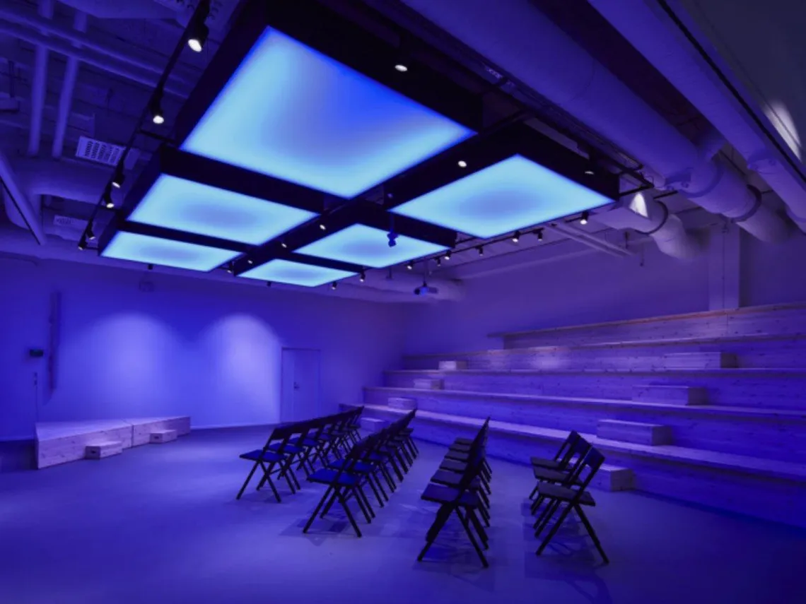The interior design concept is influenced by TV studios, with environments built from a camera angle perspective, with five-metre-high ceilings, fully optimised for those who work there.