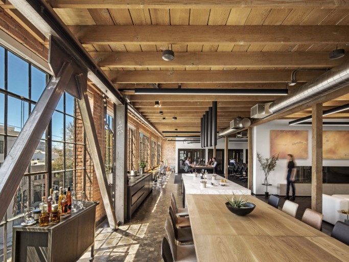 The space has been designed to preserve openness and warmth, pulling sunlight into every part. The reception desk has been designed like a jack knife, and can convert to a registration area for events. A living room with inlaid leather flooring and warm lighting lies beyond this, with a fireplace and chairs for the firm's characteristic fireside chats. Glass rooms allow natural light to flow through the space, and provide private areas for conferences, meetings and calls.