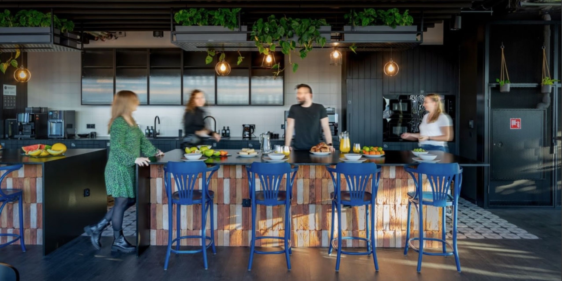 Similarly, the industrial code of the PwC SDC office arrangement is broken by the kitchen occupying almost half of the 9th floor. It is the only such space in the entire office. In a way, it forces employees to interact with others, encouraging integration. This place was designed as a meeting space, and its centerpiece is a large table. Arrangement elements that soften the industrial interior are also present here – upholstered sofas, chairs, and armchairs in various colours. There are also many live plants, and the kitchen leads to a spacious terrace with a panoramic view of Katowice.
