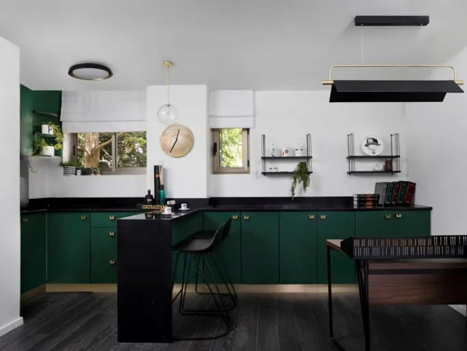 At the entrance of the space, a wall with gold-veined black marble displays the firm's logo. A coffee corner and waiting area welcome visitors into the space, and to create the required atmosphere, the cabinets are in a shade of teal green, on a gold base with black seats and shelves.