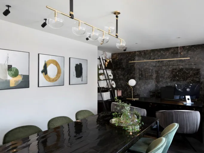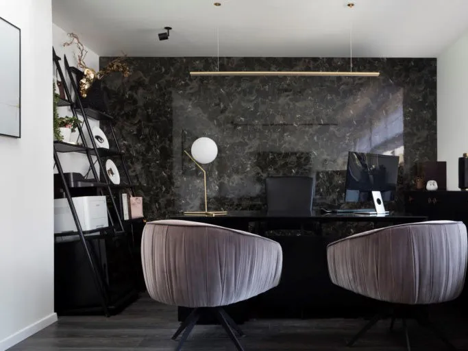 The power wall faced with rich gold-veined marble constitutes the background for the entire workspace and is a connecting theme for all parts of the office. An emphatic black colour theme provides a high-status atmosphere, with chairs and decorative objects giving additional colour, and softening the typical rigid feel of a lawyer's offices.