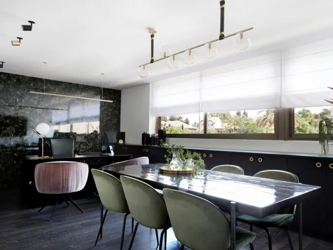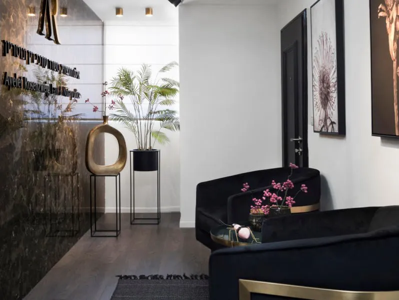 All the other rooms are furnished using the same colour palette, black being the uniting colour with touches of nude pink, brass and green repeated in various elements. Artwork done by local artists is apparent throughout the office, in the entrance lobby, the associates' and secretaries' rooms, while natural vegetation provides a soothing atmosphere, tying in with the enchanting view of Jerusalem.