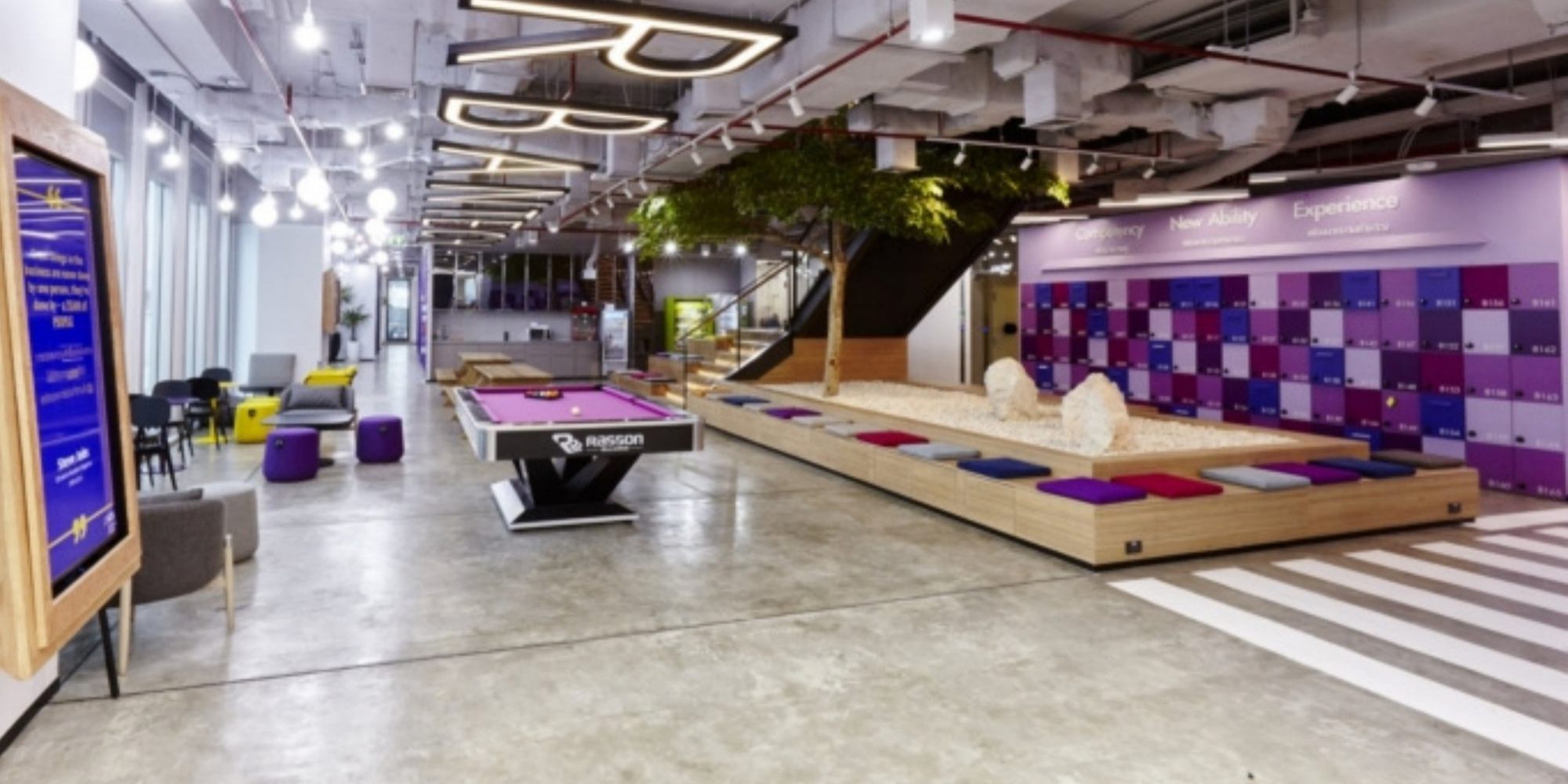 The design concept is “urban tech” as the business’s nature is all about technology, connection and the community. So, the design was integrated by using urban elements, for example street seating, a large tree and road markings. Furthermore, the overall look and feel for SCB contact centre incorporated rustic materials, for example, a concrete vinyl floor, exposed ceilings, and the use of wood and metal features.