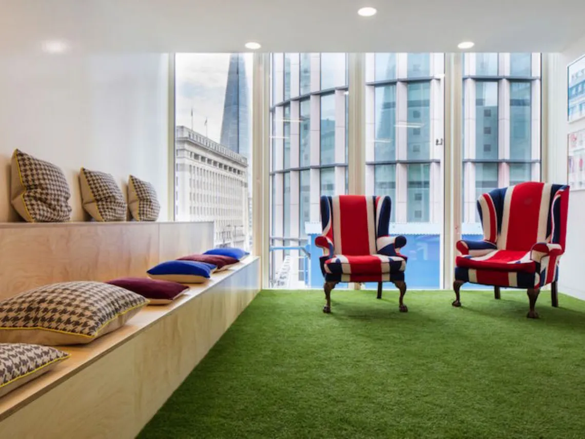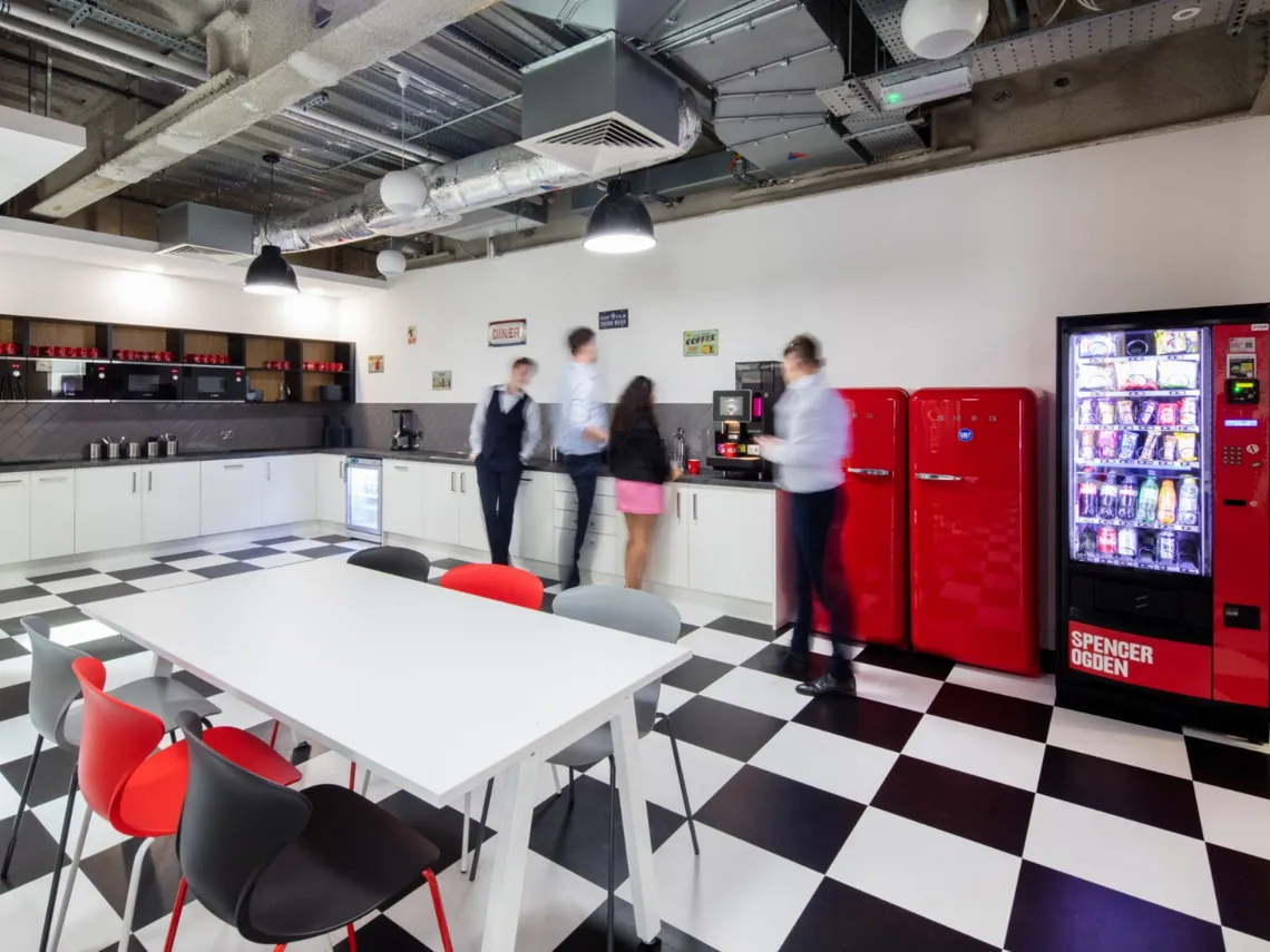 The London Headquarters of Spencer Ogden is an office that is known for its quirky style and overall functionality. It features a myriad of bold colours throughout, with patriotic red, white and blue, bare brick, bespoke office prints, red booths, a neon underground tube sign, games room, table tennis and much more.