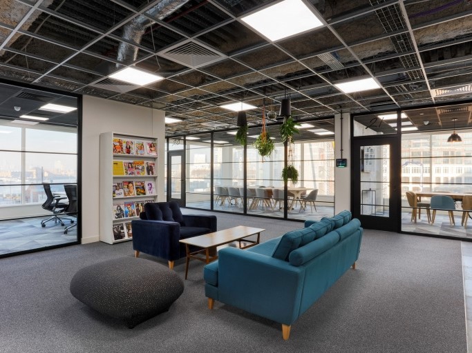 They were asked to create a Brooklyn Loft feel in a 1980s Canary Wharf office building. They began by stripping back the Cat A finishes; popping out the mineral fibre ceiling tiles but leaving the grid, pulling up the carpet tiles to expose the patinated access floor, and spraying the grid and tiles matte black in the cellular spaces. Then they layered a variety of finishes over this stripped back base to add color, texture and pattern. The project was completed from brief to build in only three months to the great satisfaction of staff and stakeholders alike.
