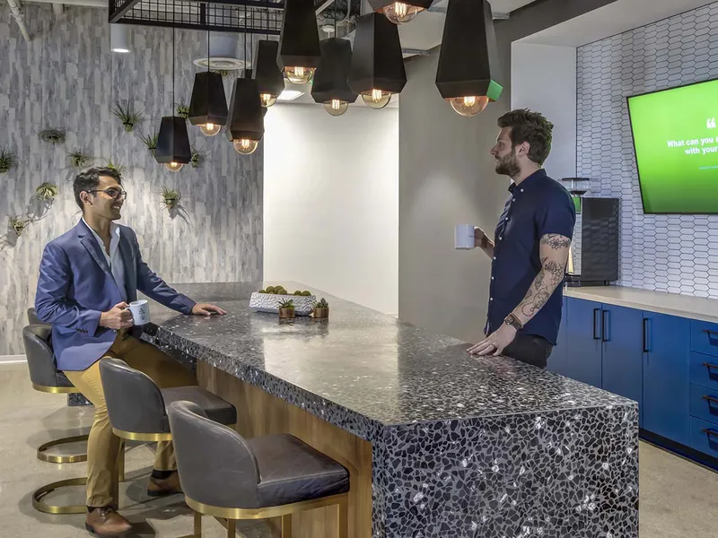 There are a multitude of work-settings to inspire and support various activities. Each of the 450 desks are only steps from one of the six unique coffee bars, and a mix of formal and informal meeting areas as well as heads-down quiet work zones. The first-floor features access to a 100 square meter atrium used for everything from town hall meetings to morning yoga classes and lunchtime cafe seating.