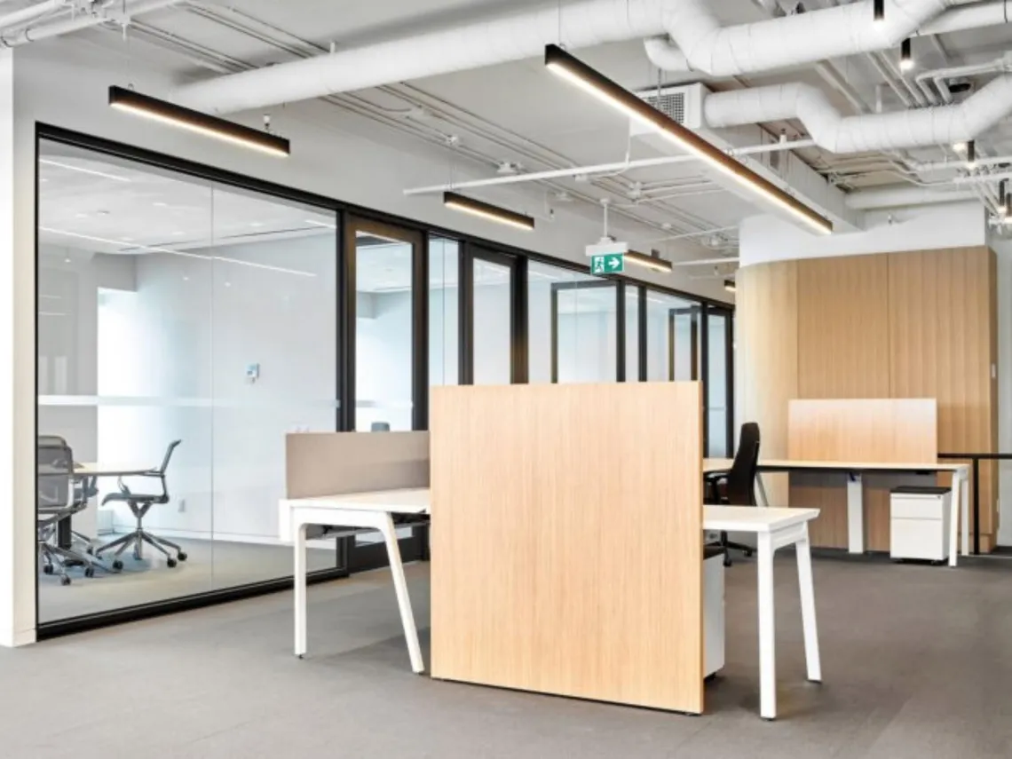 The colour palette selection is bright and airy: natural white oak panels, whitewashed concrete ceilings and gleaming glass partitions and tables.
