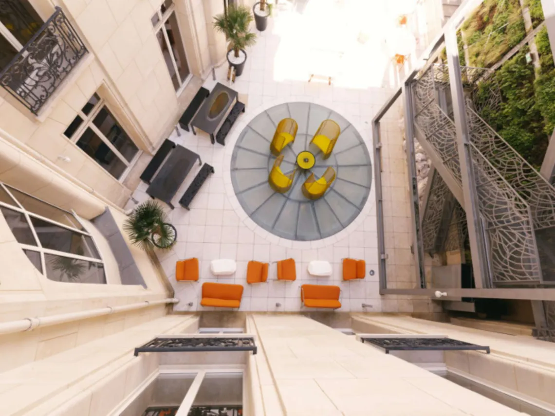 The decoration designed by WeWork is a tribute to Haute-Couture and particularly to that of Yves Saint Laurent. The terracotta clay of the gardens, the painted blue concrete with bursts of yellow, the greenery of the palms and cacti plants; All these colours and materials reference those that the couturier loved in the Jardins Majorelles in Marrakesh, Morocco and have been incorporated into the interiors of WeWork Champs-Élysées.