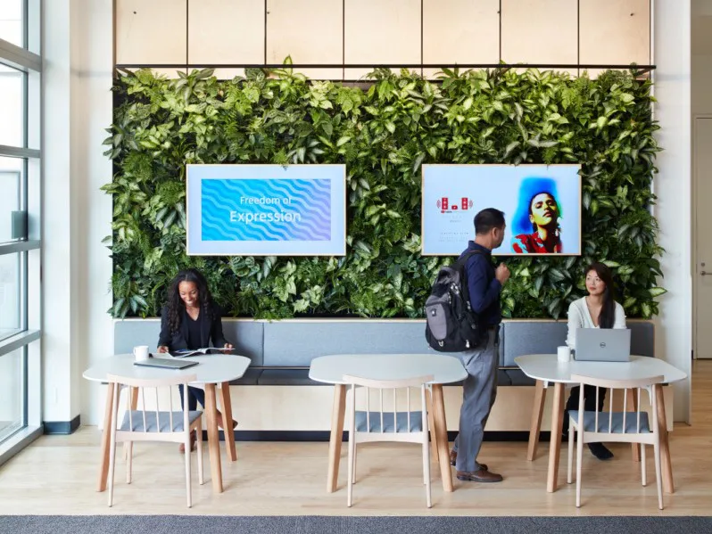 YouTube's famous "play" icon is outlined in neon in the center of the LED wall. The northern side of the lobby is lined with pockets of green wall, stacked wooden benches and high table seating.