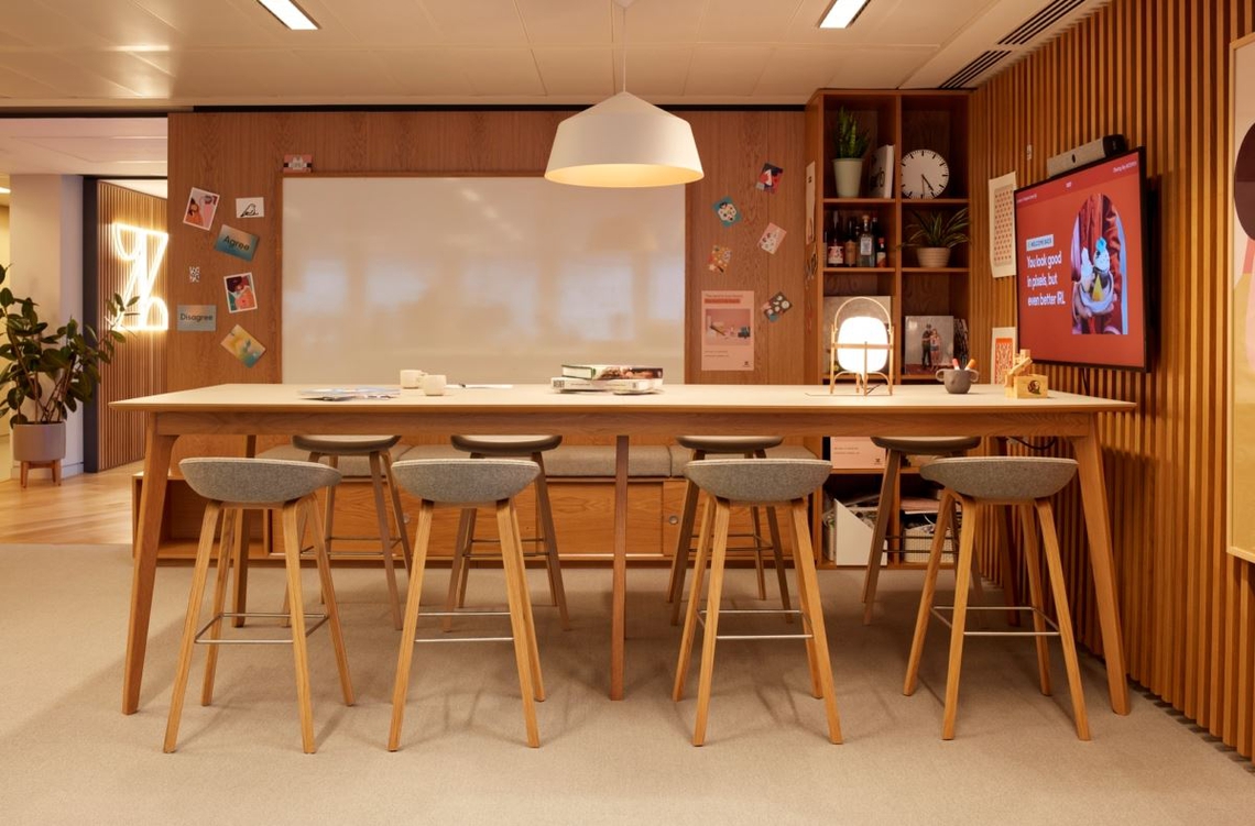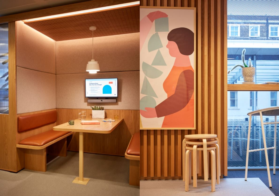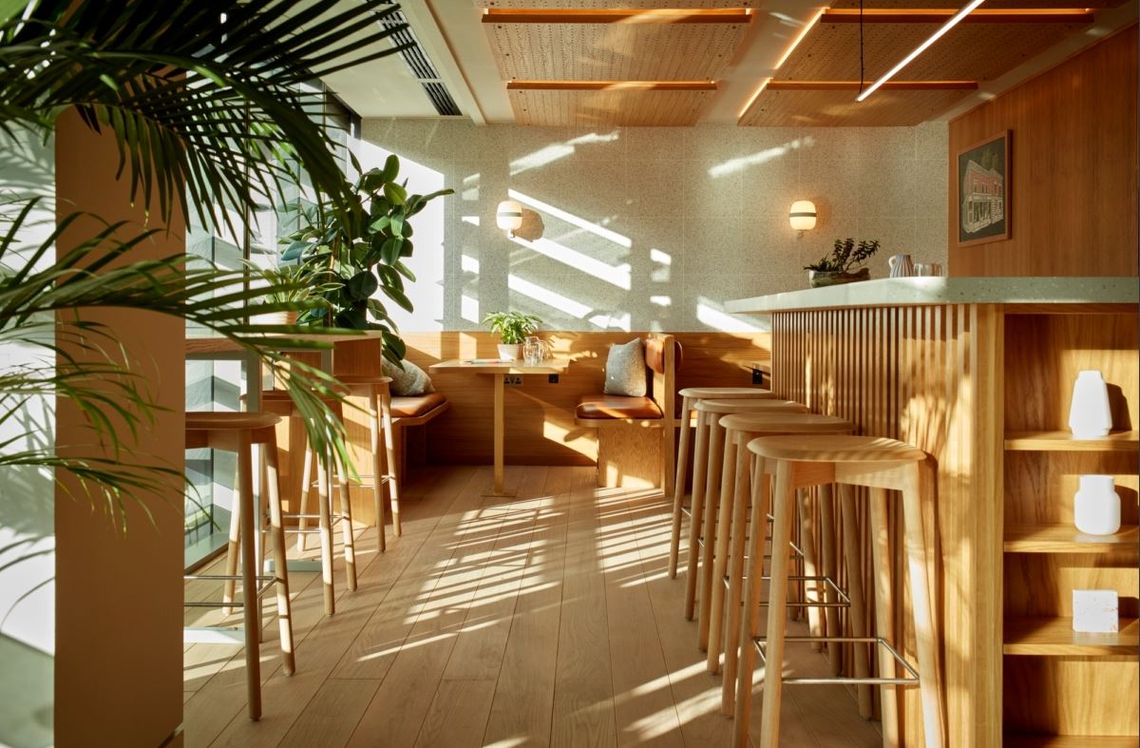The public space is aimed to spark employee connections and it is equipped with a kitchen, an event space, and a new signature cafe. The latter has been designed taking inspiration from East London historic cafes, adding an extra layer of Scandi flavor, to homage the Danish heritage of the company.