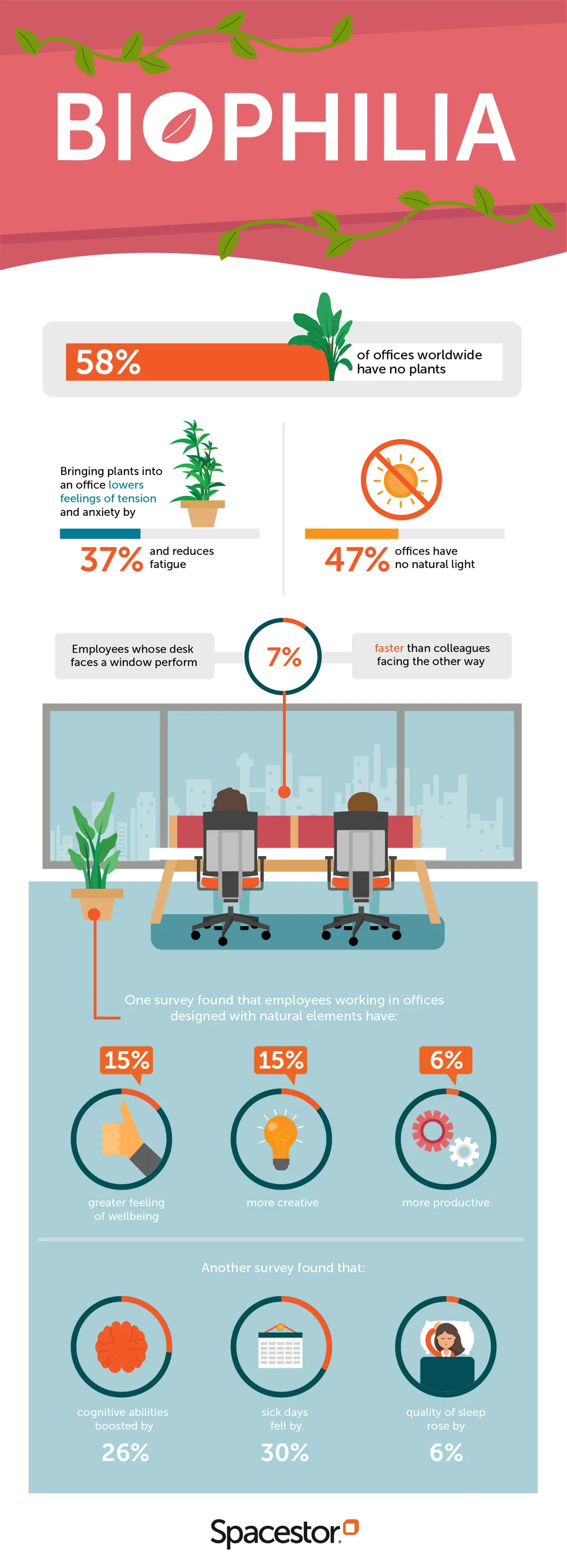• 58% of offices worldwide have no plants. • But bringing plants into an office lowers feelings of tension and anxiety by 37%, and has also been found to reduce fatigue. • 47% of offices have no natural light. • But windows, and natural light, are very important for wellbeing. And furthermore, employees whose desk faces a window tend to perform 7% faster than their colleagues who face the other way. • One survey found that those working in offices designed with natural elements had a 15% greater feeling of wellbeing, and were 15% more creative and 6% more productive. • Another found that employees’ cognitive abilities were boosted by 26%, sick days fell by 30% and, most remarkably, quality of sleep rose by 6% – in other words, they were still feeling the benefits long after returning home.