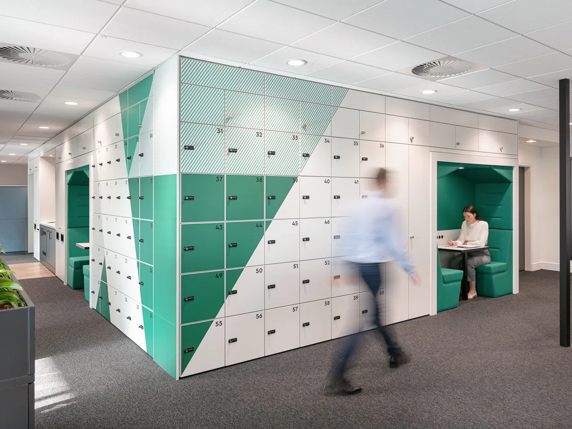 When designing communal areas, it’s important to focus on creating spaces of engineered serendipity, where chance encounters between co-workers that may not ordinarily cross paths are encouraged. These areas help build a strong culture of collaboration in high-traffic areas. Spacestor’s HotLocker provides assignable storage solutions that aren’t tied to specific individuals, making them perfect for hybrid workforces and creating a more fluid, efficient environment. This flexibility ensures that whoever is in the office on any given day will be assigned lockers near others present that day, facilitating spontaneous interactions. With breakout furniture and communal seating, these hubs transform into inviting spaces for informal networking.