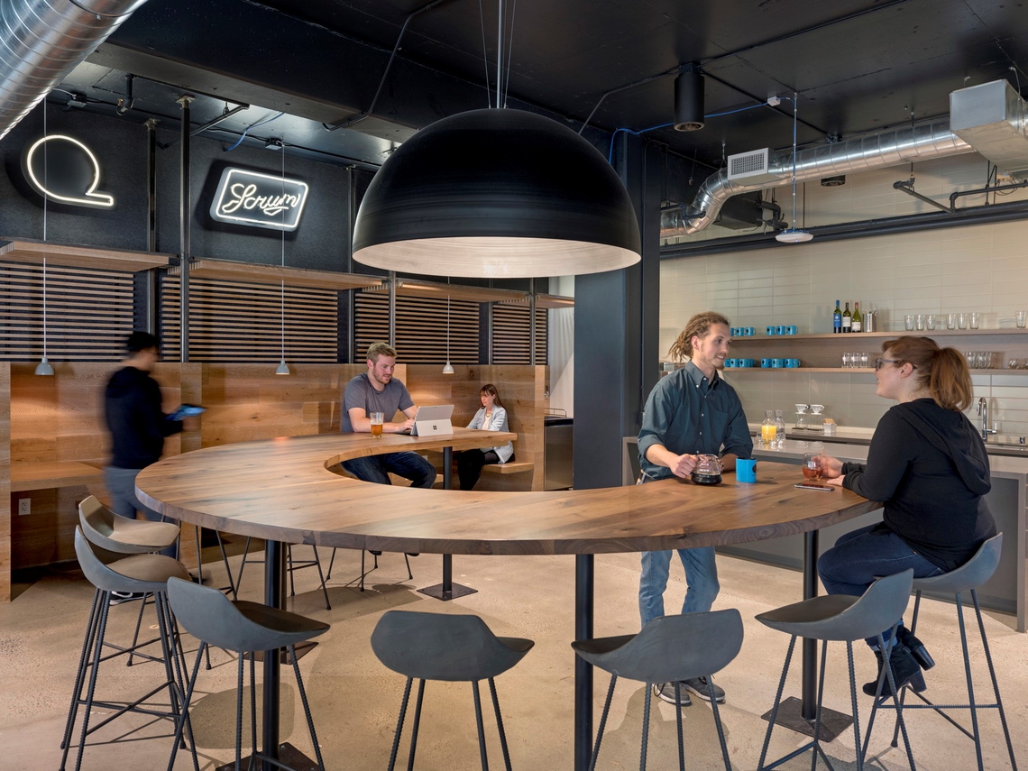 The last room, “Transformative”, featured more muted natural tones of steel and wood and leather in order to create a cooler effect. Shades of green and blue are also thought of as cool colours. They bring the natural world of meadows and rivers and lakes to mind and help you to relax. The colour blue, for instance, helps to slow down your breathing and lower your blood pressure, so it’s great for reducing stress at work. Having office plants and views of natural landscapes also has a beneficial effect on our moods of course: not only do indoor plants improve air quality, they can also reduce the number of sick days and raise productivity.