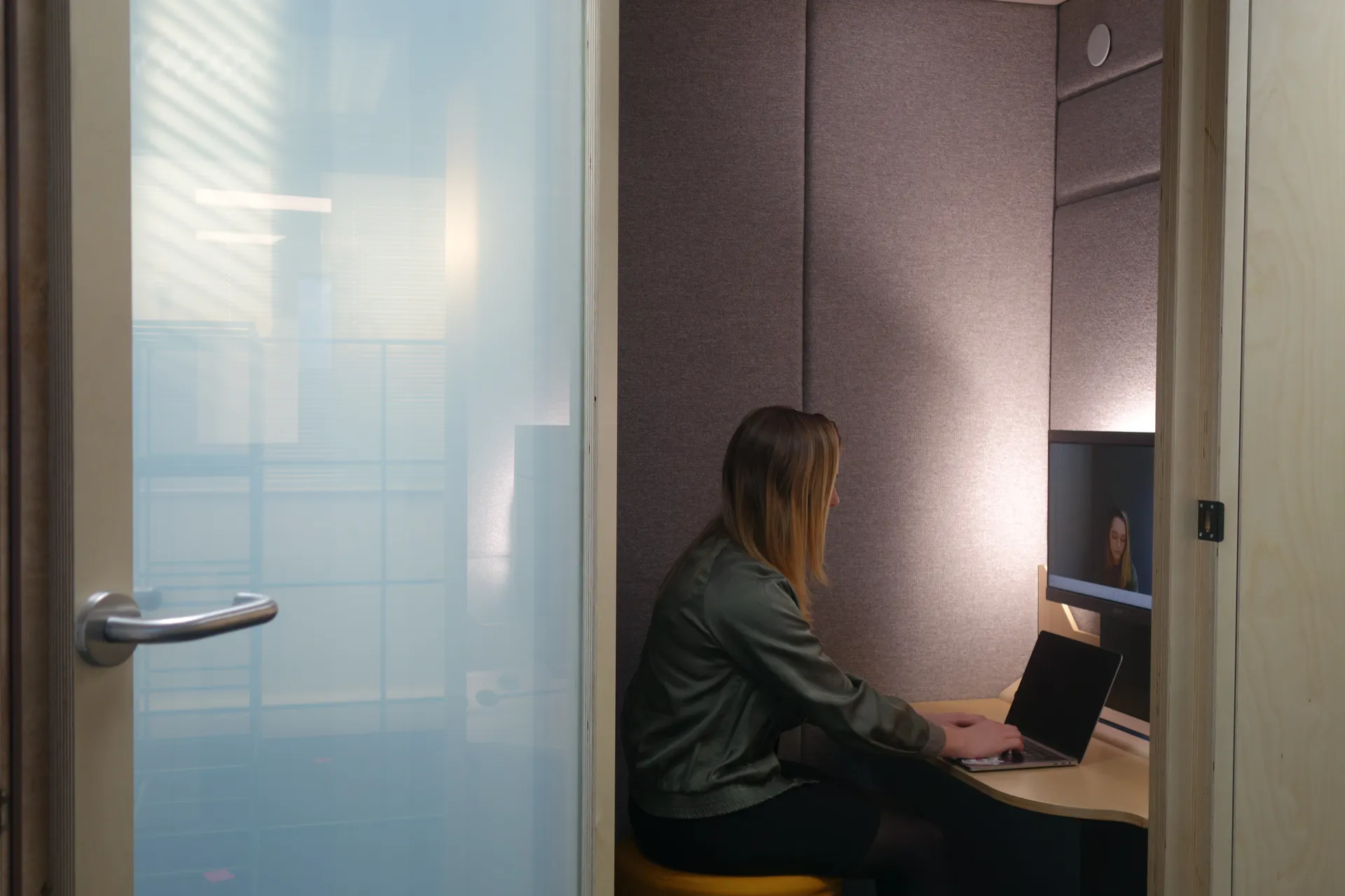 Workplace video booths are deeper than phone booths, which allows the camera to be positioned a comfortable distance away, avoiding unflattering, mugshot-like close-ups. They’re also designed with inclusivity and accessibility in mind. Lighting and interior finishes are chosen to support the visual representation of all people, regardless of skin tone and clothing choice, so that everyone looks good on camera; which helps with self-confidence, legibility and clarity.