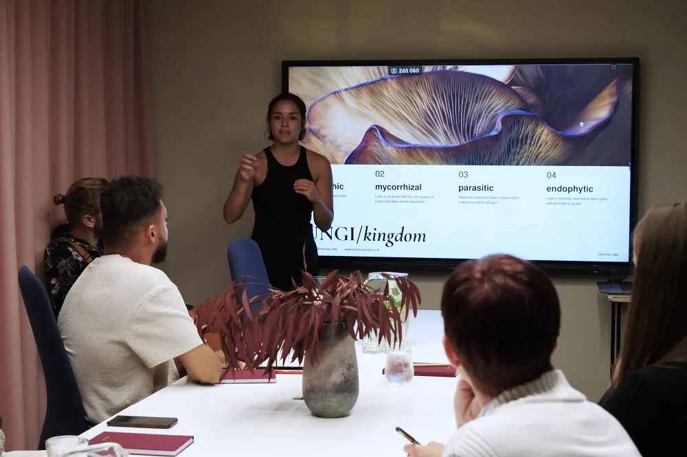 Nature's Potential: Building with Mycelium. We were joined by Osmose Studio for a masterclass on mushrooms, that included a deep dive into the functions and potential of mycelium, a material, emerging in the interior industry as a serious player for the natural furnishing and building of staple ingredients already in the office or home. Guests were then taken through the initial processes of creating a mycelium structure; mixing, molding and sealing their creations, whilst learning about the aftercare and nature of this living material in a hands-on workshop which is the first of it's kind in the UK!