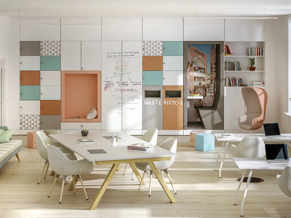 Storage walls use space dynamically, they’re well suited to the millennial mindset and they help to make a positive impact on your employees’ experience – and happy employees make for happy workplaces. Although it’s frequently overlooked, storage is one of the most crucial elements for making a tidy, organised, and visually attractive workplace that will relieve stress, and enhance productivity and creativity. In today’s perfect office, make your walls work for you.