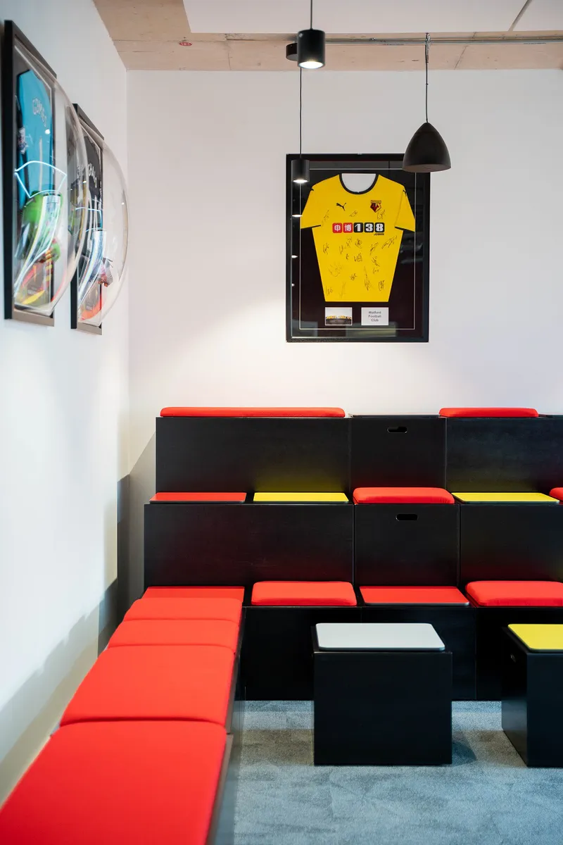 A bold and modern fitout at Chingford Foundation School showcasing our Bleachers, Railway Carriages and Mono Desking