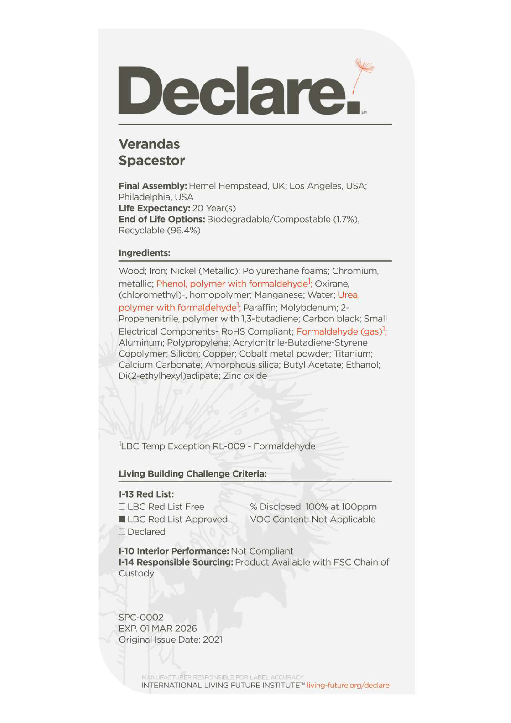 On Verandas, we're also pleased to be able to provide a Declare Label, offering an additional layer of transparency by clearly outlining material ingredients and environmental attributes. This label helps you understand the composition and sustainability performance of the product, supporting informed, responsible design and purchasing decisions.