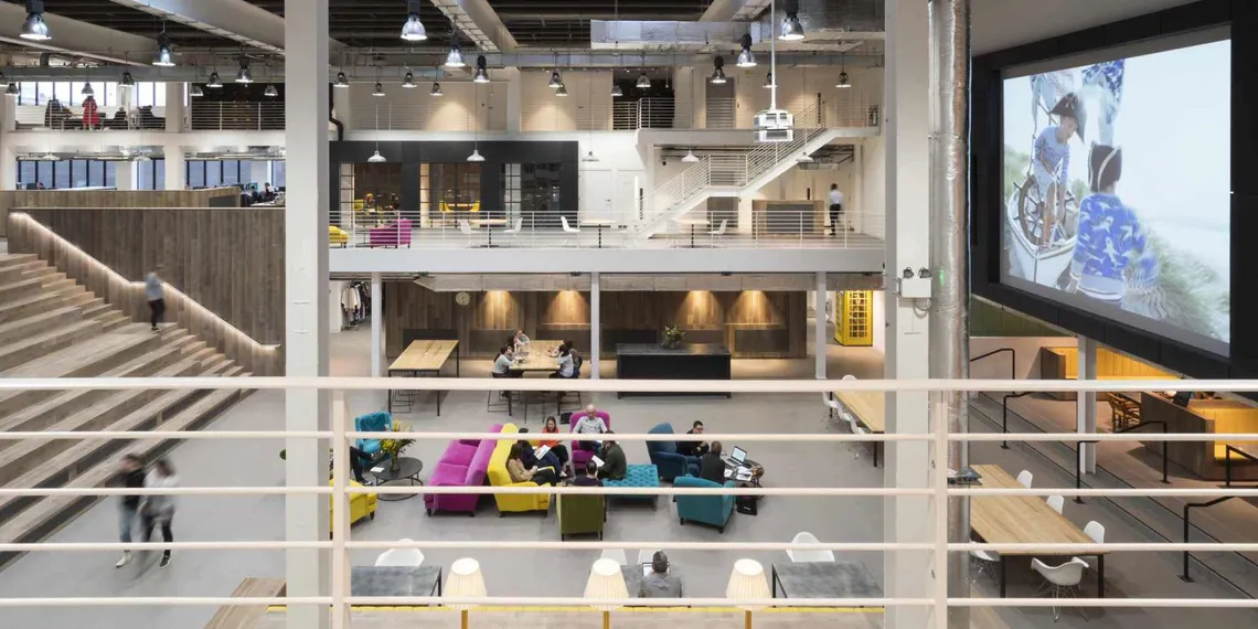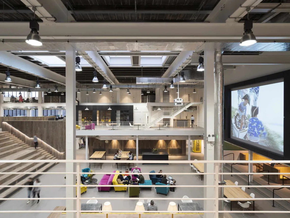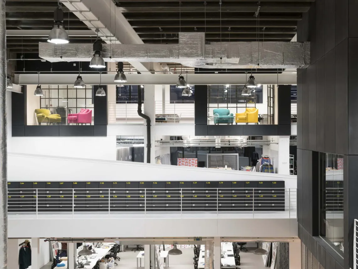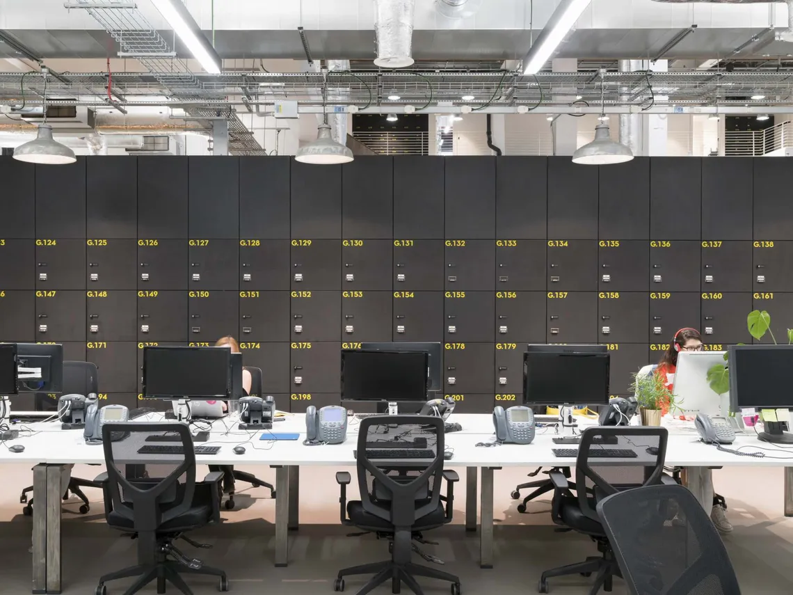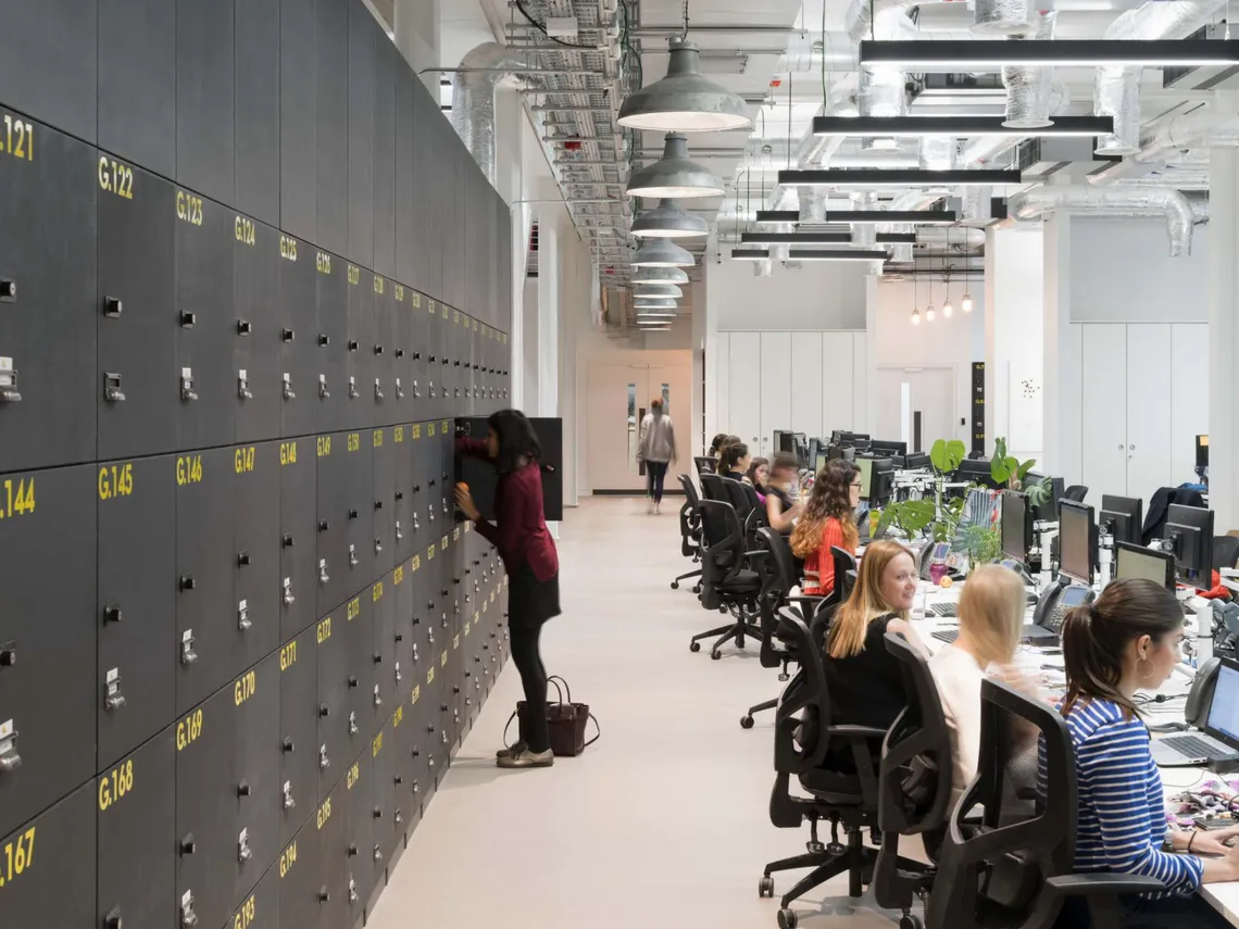 Spacestor were happy to supply some huge walls of our freestanding HotLocker lockers, finished in weathered black and highlighted with yellow numbering to match the new industrial aesthetic. These lockers became features in themselves: whether overlooking the large central atrium, or acting as a practical zone divider on the work floor. As the company wanted to promote a more agile way of working, with many different zones to choose between, the new Boden House has 1.4 work points for each of its 500 employees; and our HotLocker systems provides staff with all the personal storage they need to make this kind of hot desking possible.