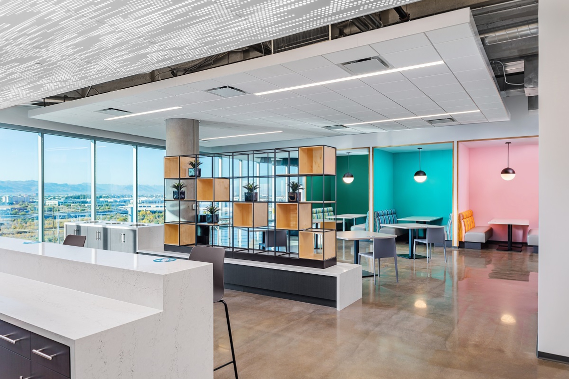 The first floor holds the primary functional spaces including the spacious reception, collaboration and meeting spaces, as well as bench desking workstations in the open office. Working with Workplace Resource Colorado, we provided our Palisades Grid to create visual and acoustic divisions between the different neighbourhoods within the office. Providing the needed levels of privacy between the focused workstations, and the more relaxed breakout areas, the Palisades Grid still allows connection between the spaces to flow, as well as natural light to filter through. As testament to this well-executed design, the workspace has been awarded the 'Office Tenant Improvement Project of the Year' (more than 60k sqft) at the prestigious Arizona NAIOP Awards in May 2021. And not only this award, but also the RED Award for Office Interior of the Year!