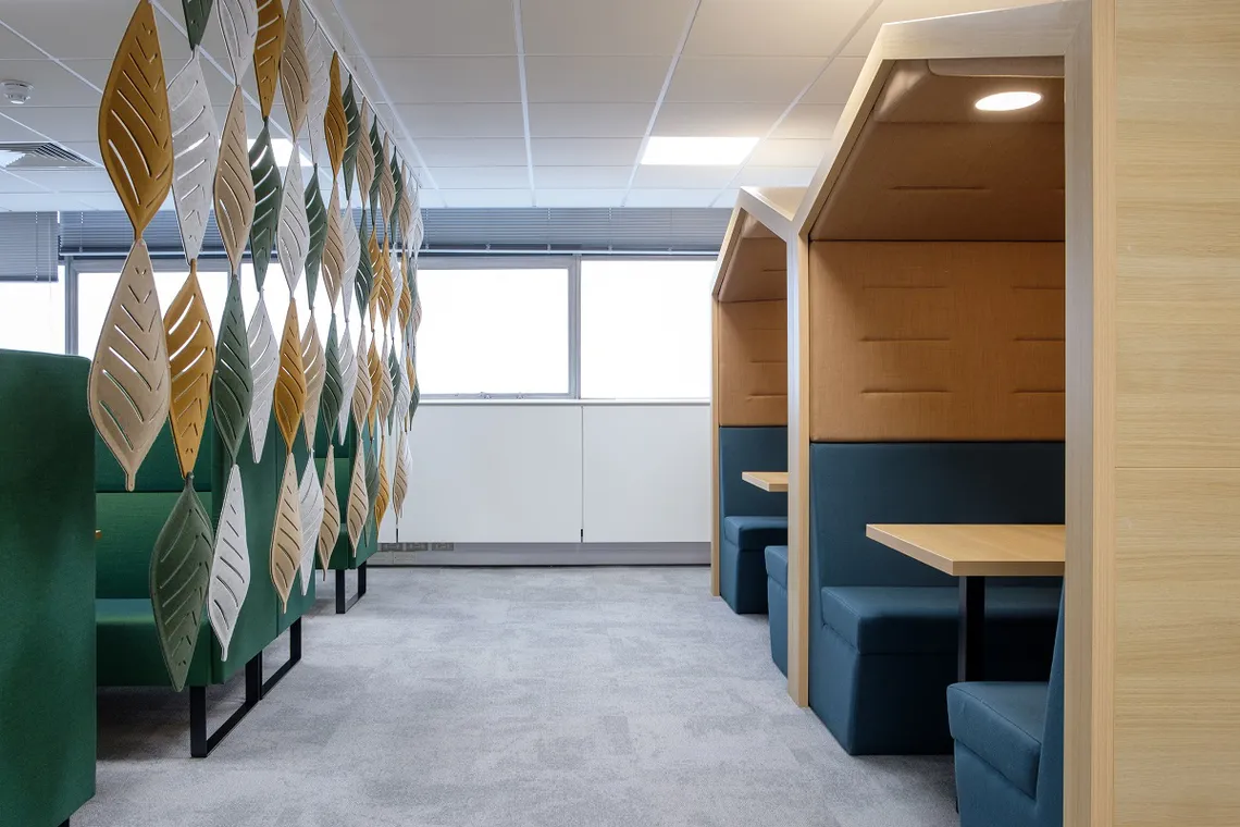 Royal green seating, large windows and soft grey flooring mean the environment is light, open, and spacious. Although essentially open-plan, artistic acoustic barriers create spaces within the larger floorplan, initiating zones and adding more comprehensive functionality for employees. Technological integration and in-built flexibility mean that the UK base is a destination worthy of the commute, drawing employees for the experience and culture evoked by the built environment. Fujitsu Bracknell, a reflection of the company’s brand with personality but familiarity, has been warmly received, and authentically enables the Fujitsu Work Life Shift.