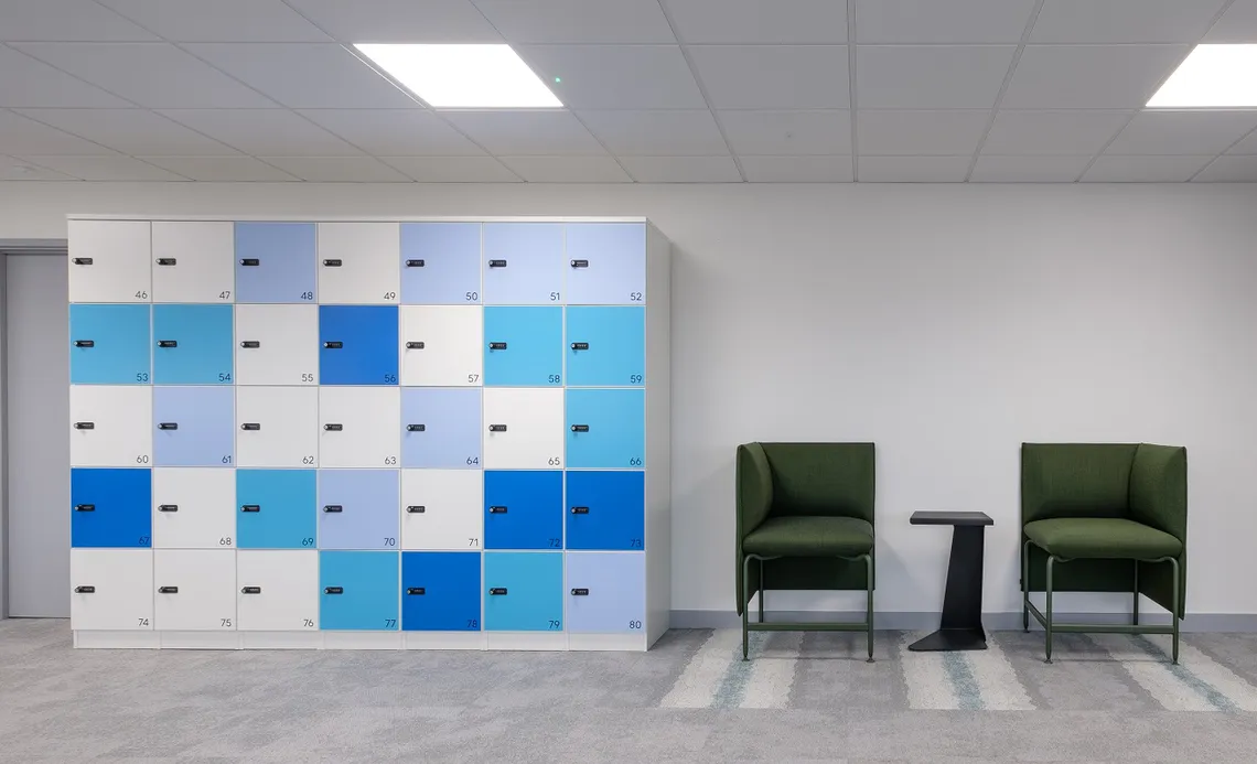 Banks of HotLockers, with a monochromatic but colorful palette, are provided for employees as a personal storage solution. Custom graphics and pure white cladding with simple combination locks, features which have been chosen from a highly customizable range of finishes, materials, and lock types. Both Railway Carriage and HotLocker have Declare Labels and are LBC Red List Approved, aligning with the very high focus Fujitsu has on sourcing, sustainability, and accessibility.
