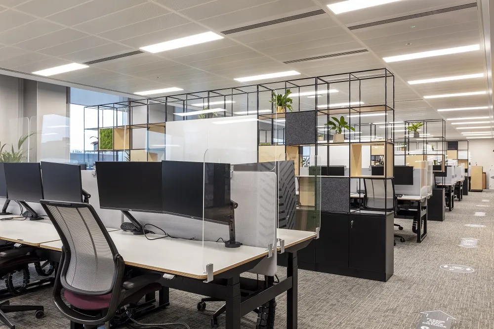 In between the rows of bench desking, Palisades Grid provides an aesthetic and effective zone divider. With its mid-century style black grid and plywood accessories it provides the necessary separation of space within the open plan office without building walls or completely blocking light.
