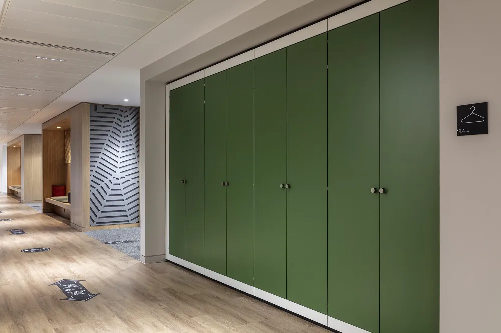 Set in the heart of London, the new workspace is spread out over 24,000 square feet and provides a plethora of different space types including a formal reception, breakout areas, a sophisticated bar, bench desking, quiet seating nooks and personal storage. Working with BW Interiors at Cat A and Operandum at Cat B, we were pleased to supply several of our solutions to the space. Throughout the space, several different banks of our lockers give employees their own personal storage area within the workspace. Tying in with the biophilic looks and feel, the lockers have been designed in organic greens and plywood finishes to complement the raw and natural feel of the space.