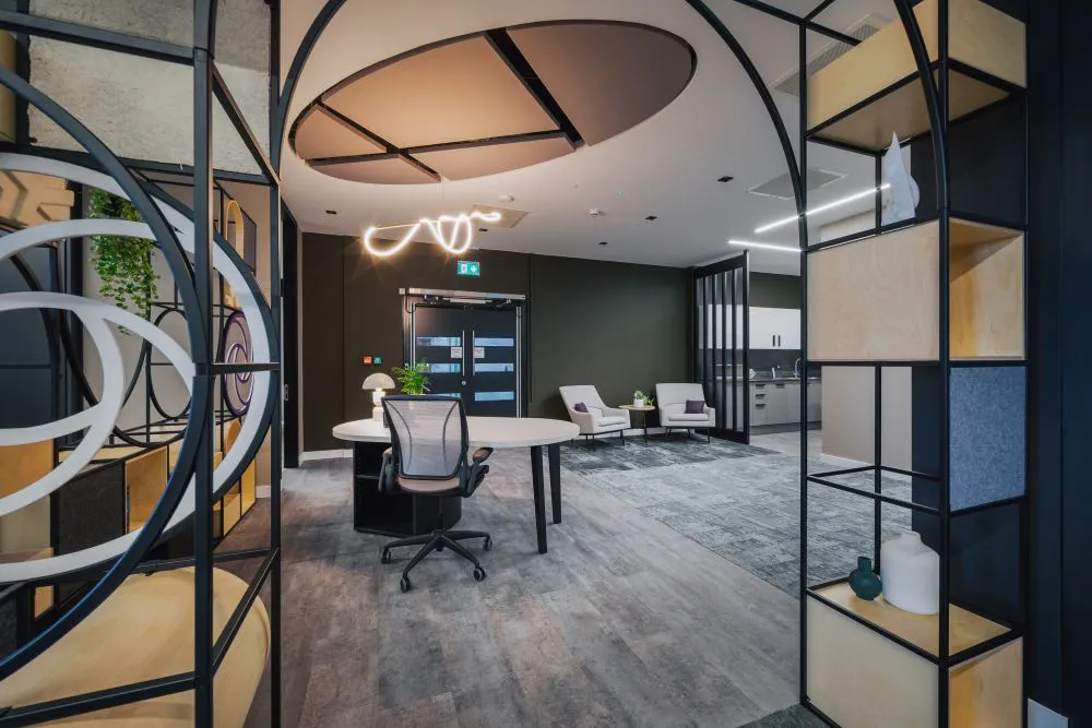 Rather than gutting and starting over, Claremont embraced the power of reuse. Using their in-house carbon calculator, they made strategic design choices that led to a 22.5% carbon saving. 65% of existing furniture stayed. Security doors were reborn as statement ceiling rafts. Old perch desks now live on as dining tables. From refurbished legs to fresh desk surfaces made with sustainable materials, every detail was an opportunity to reduce waste and add meaning.