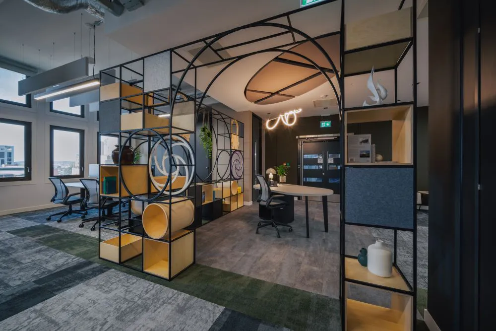 To set the tone the moment you step in, Spacestor’s Palisades II creates a striking welcome arch. Built with curved grid and filled with shelving, planter boxes, mycelium panels and curved ply, the zoning frames Grant Thornton logos and the whole reception with warmth and intention. Palisades II creates a threshold that says: this is a space with purpose, personality, and people at its heart.