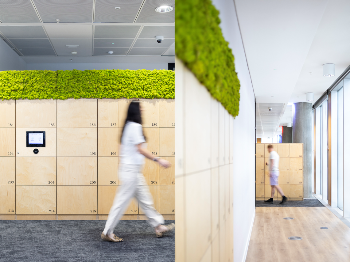 An existing installation of Hotlocker Forte was kept in this building, with its quality build allowing longevity and re-use over and over, a sustainable solution that saves on materials being used. The planter panels on top, with the light woodgrain finish bring a calming feel with the colour and texture, along with the natural light from the floor-to-ceiling windows.
