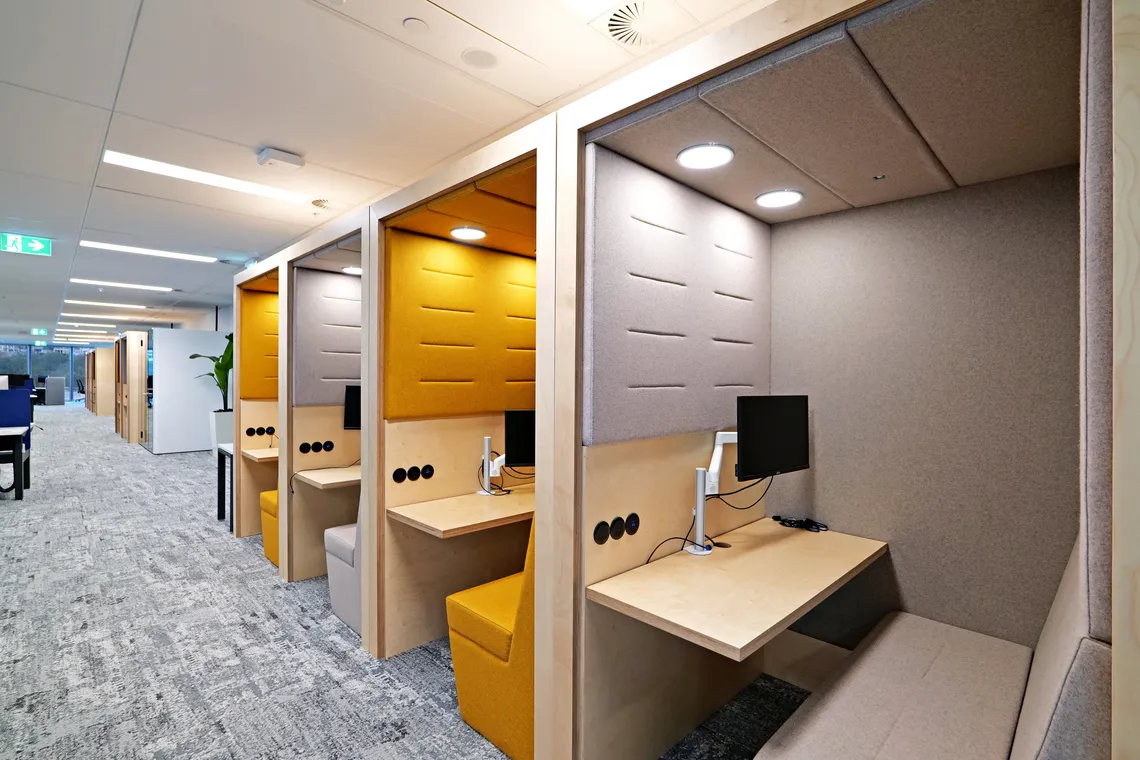 Recognizing the need for focused workspaces that remain connected to the overall office environment but provide some acoustic protection, Spacestor provided Portals Open. The single-user spaces are a quiet retreat for employees, affording the ability to concentrate whilst supported by integrated technology for an enhanced user experience. We also worked with Jacobs to provide a custom Portals solution which features double-width in-built seats, ideal for impromptu catchups or one-on-one meetings in a more private setting.