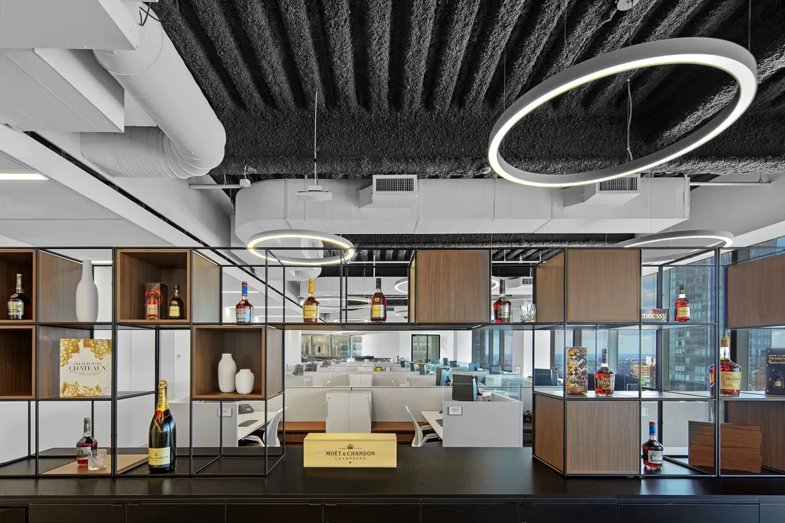 Wanting to inspire collaboration amongst and beyond teams as well as creating an inclusive space for everyone, TPG based the floorplate on an open-plan concept of workspaces around the perimeter with integrated storage and shelving throughout the design. Providing a simple and yet highly effective division between the various neighborhoods, several configurations of our Palisades Grid afford the necessary levels of privacy, without building walls. Customized to Moët Hennessey's exact requirements, the Palisades Grid provides luxury looking storage as well as a shelving and display area for their iconic products and branded merchandise. Equipped with power, the storage units house their printers and other tech as well as multiple refrigerators to keep the all-important drinks cold!
