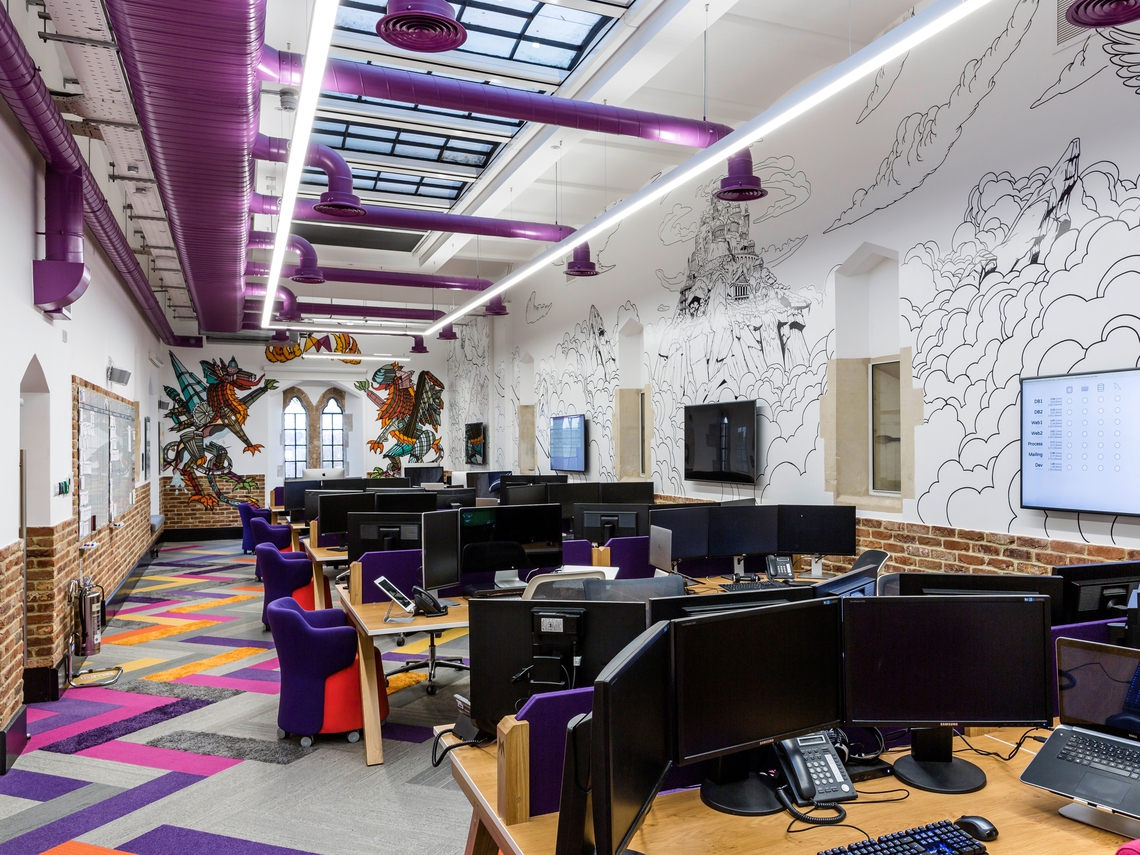 The castle provides many different types of workspaces; its flexible environment encourages both collaboration between colleagues and private individual projects. Its attention to detail is immense with features such as the cinema, 22,000 pennies stuck down by hand in the boardroom, and the coats of armour. These details contributed to the hundreds of job applications received in the days after the workspace was revealed.
