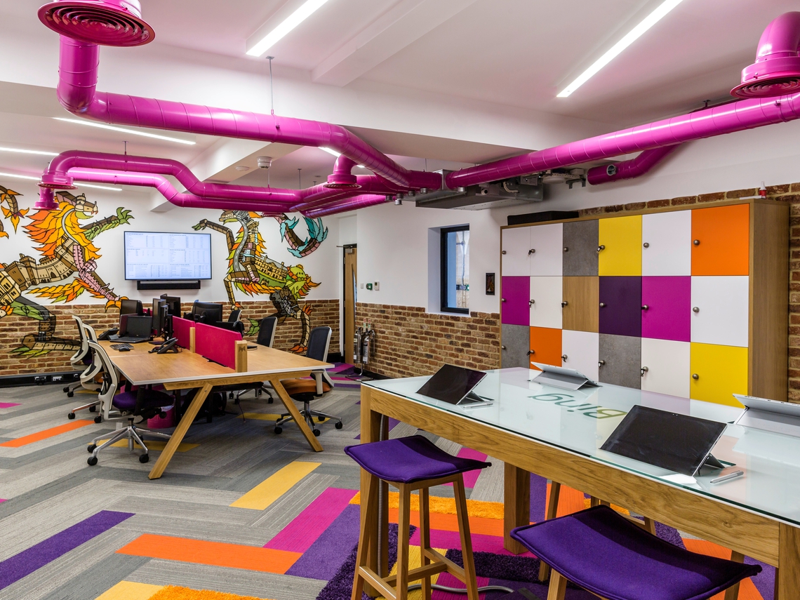 We also provided lockers around the castle, located in the offices and the shower rooms. money.co.uk wanted the lockers to be fun and interesting, and extended their brand into the workspace with the finishes matching their vibrant brand colours.