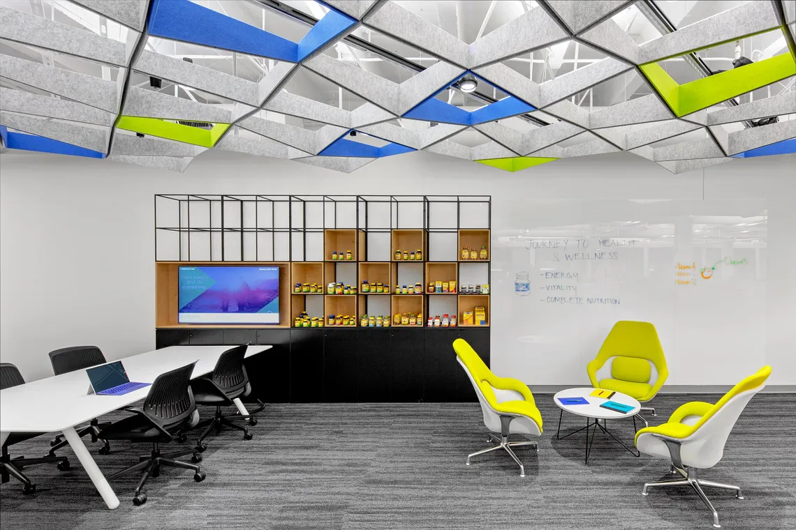 Pharmavite helps people live healthier lives and is focused on devising complete nutritional products that incorporate essential nutrients and minerals. They have won the trust of professionals and retailers in their field, as well as ensuring that their employees feel supported, and that wellbeing is at the forefront of the company's concerns. As part of this they partnered with HOK to create a striking space featuring a mix of geometric design, natural woods and biophilia, dark lines and bright color.