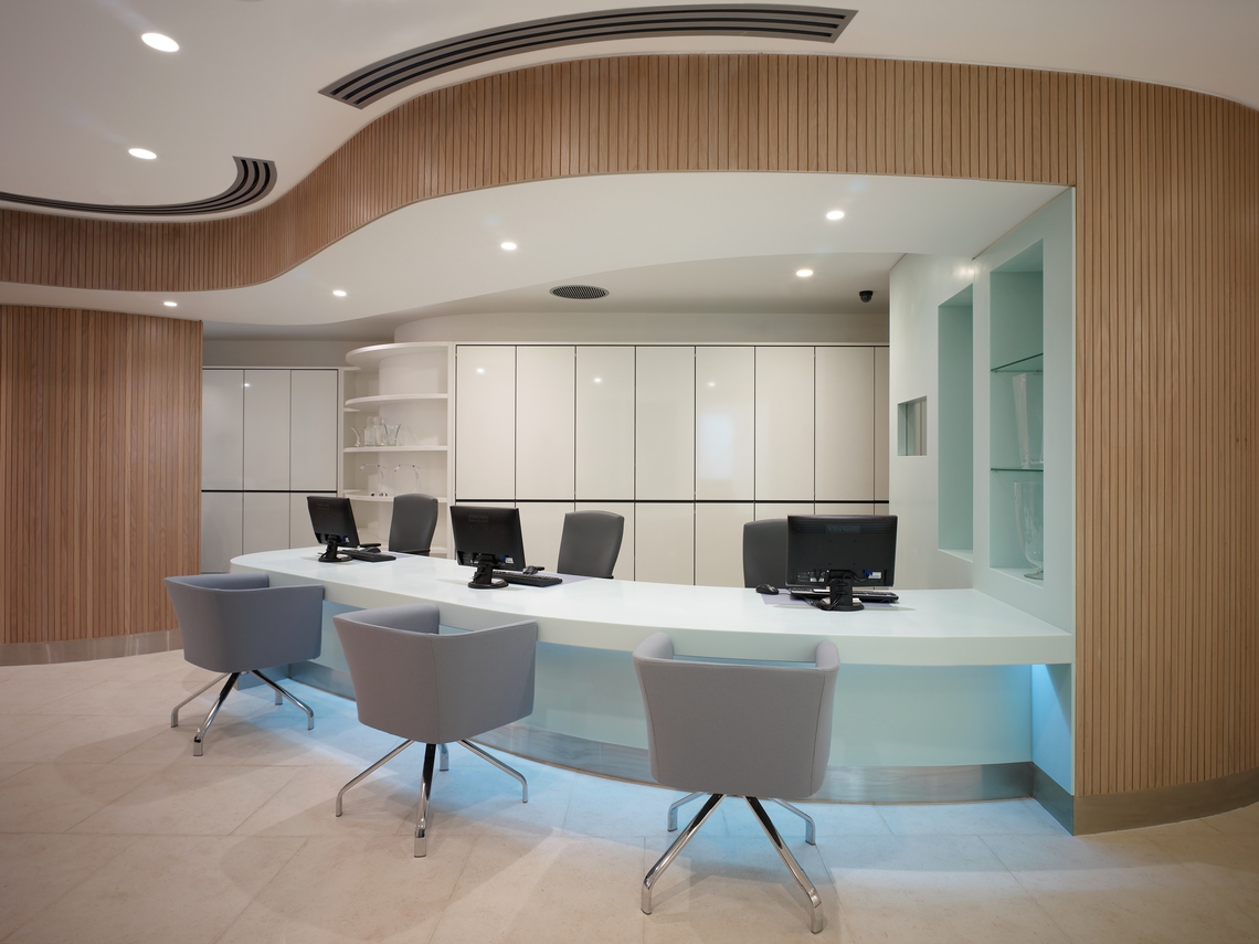 We used capped and mid-height wall abutting Storagewall in white laminate, with upgraded individually designed monolithic doors with discreet finger-pulling handles embedded within the structure. Lit alcoves with coloured back-painted glass lining and bespoke curved shelving was installed in the reception area.