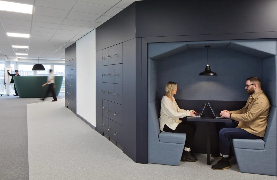 Alongside this was our Railway Carriage, specified in the same finishes to have a quality and seamless look. In addition to this, one of our Railway Carriages was scribed in to a run of Storagewall and Lockers, to create the bespoke feeling of joinery through using modular furniture. Having this mix of storage options provides both personal and shared storage for colleagues to utilize.