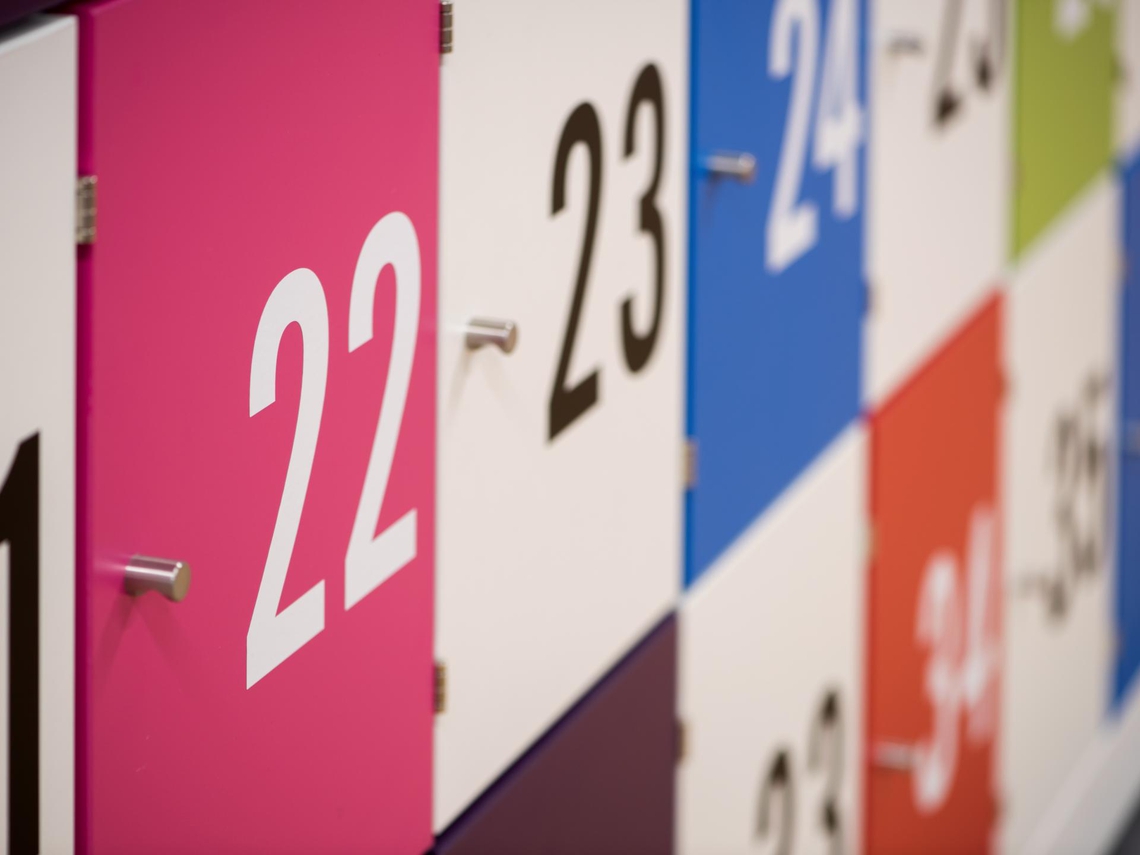 A colouful bank of modular HotLockers on a background of modern white gloss with customised numbered doors.